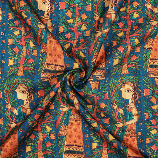 Peacock Blue And Orange Madhuvanii Pattern Digital Print Art Tusser Silk Fabric Peacock Blue And Orange Madhuvanii Pattern Digital Print Art Tusser Silk Fabric
