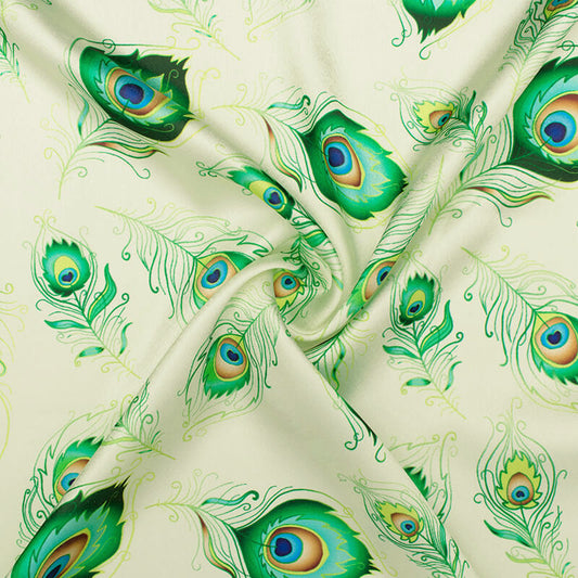 -10% offCream And Green Peacock Feather Pattern Digital Print Japan Satin Fabric Cream And Green Peacock Feather Pattern Digital Print Japan Satin Fabric