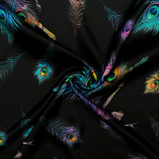 -10% offBlack And Multi-Color Peacock Feather Pattern Digital Print Japan Satin Fabric Black And Multi-Color Peacock Feather Pattern Digital Print Japan Satin Fabric