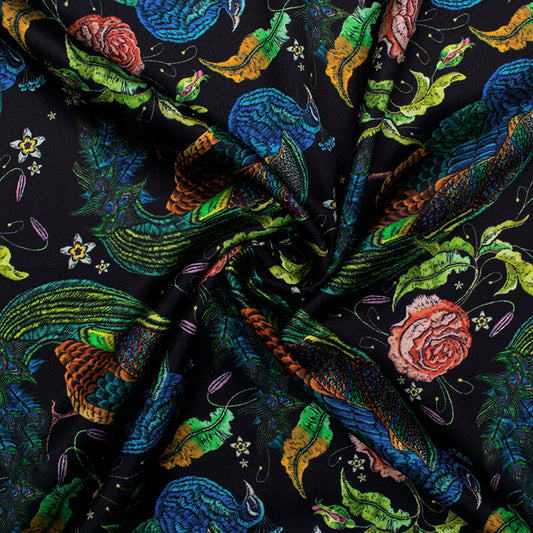 -10% offBlack And Green Peacock Pattern Digital Print Japan Satin Fabric Black And Green Peacock Pattern Digital Print Japan Satin Fabric