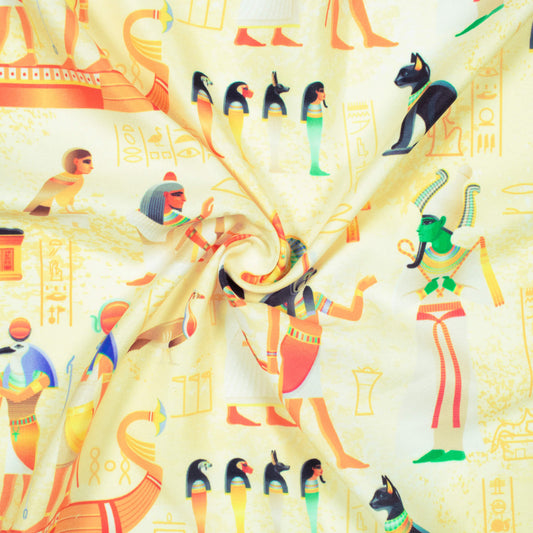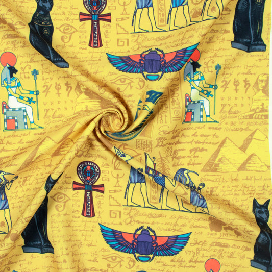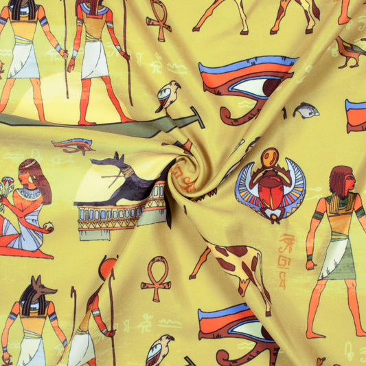 Dijon Yellow And Multi-Color Egyptian Pattern Digital Print Ultra Premium Butter Crepe Fabric Dijon Yellow And Multi-Color Egyptian Pattern Digital Print Ultra Premium Butter Crepe Fabric