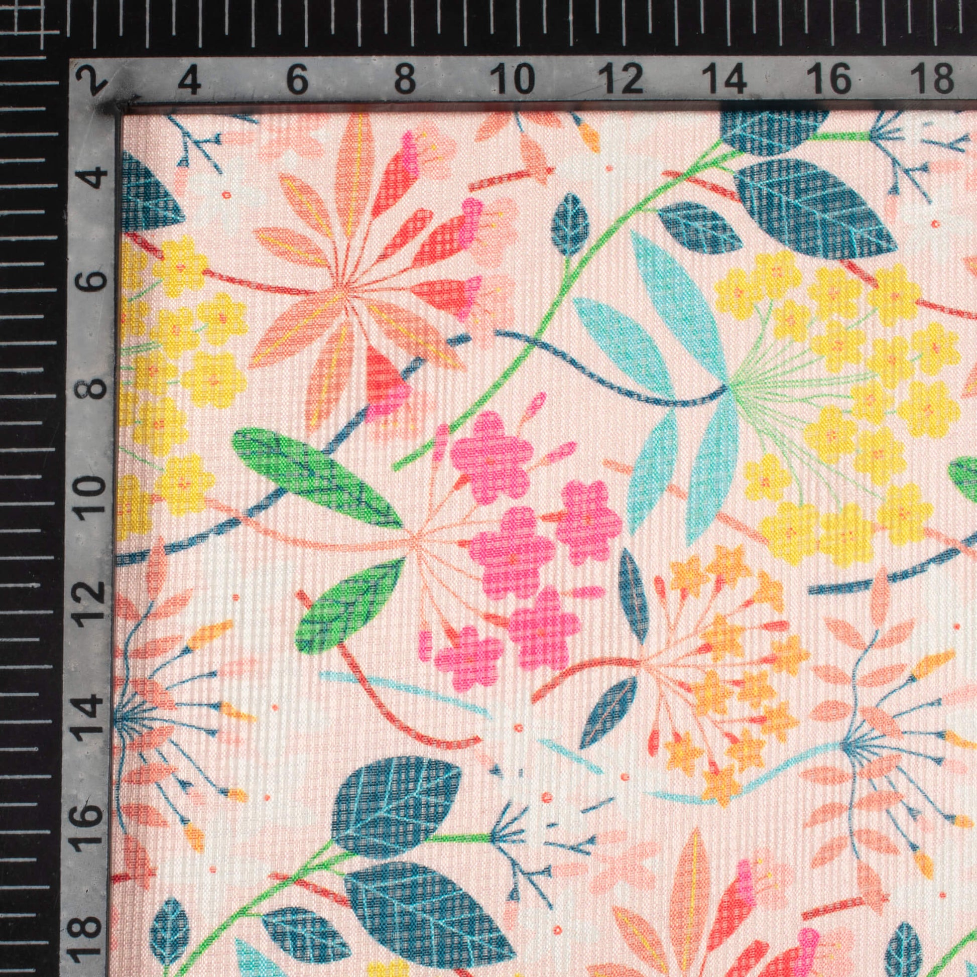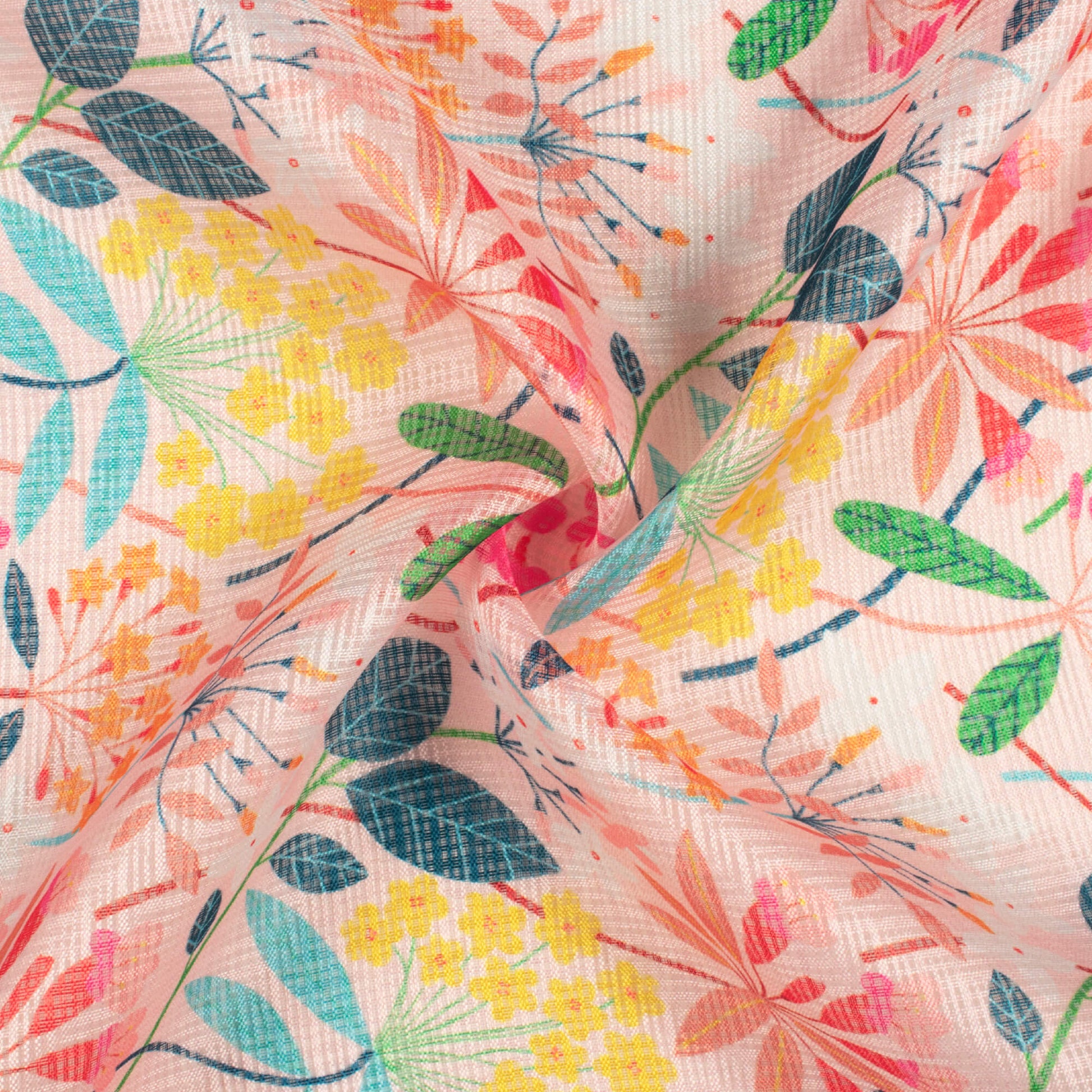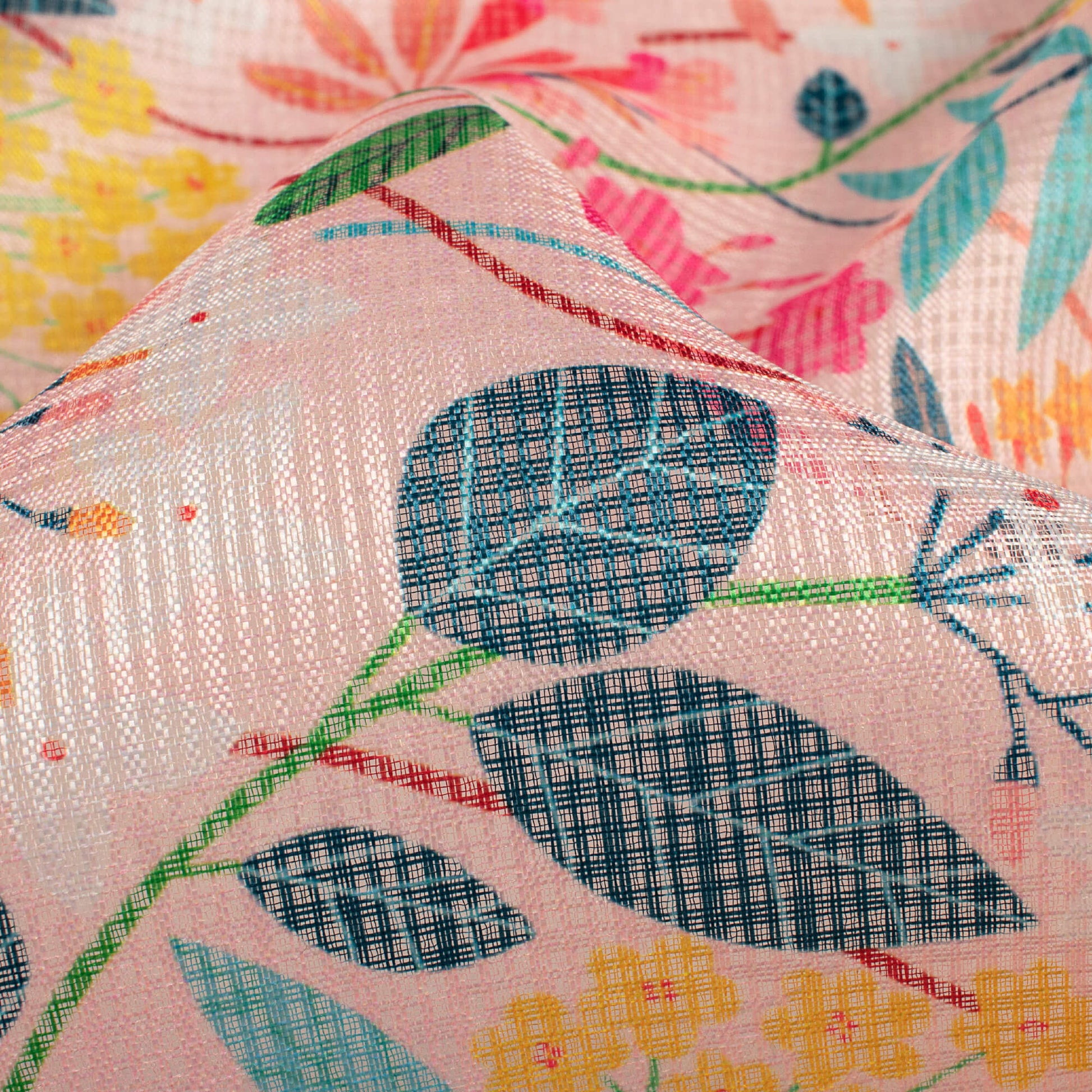 Pale Pink And Green Leaf Pattern Digital Print Kota Doria Fabric