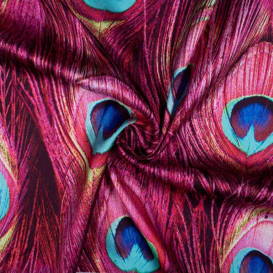 French Rose Pink And Electric Blue Peacock Feather Pattern Digital Print Japan Satin Fabric French Rose Pink And Electric Blue Peacock Feather Pattern Digital Print Japan Satin Fabric