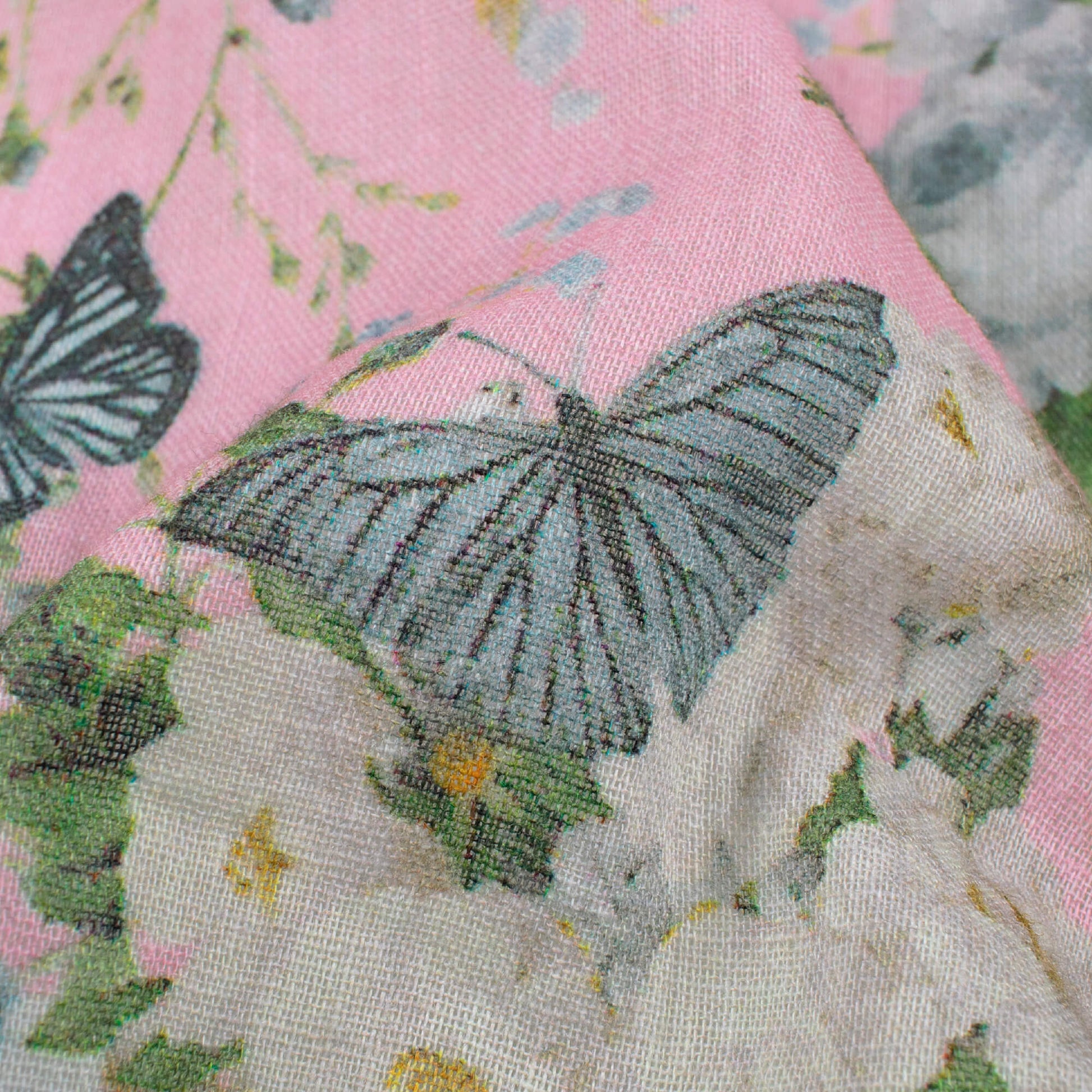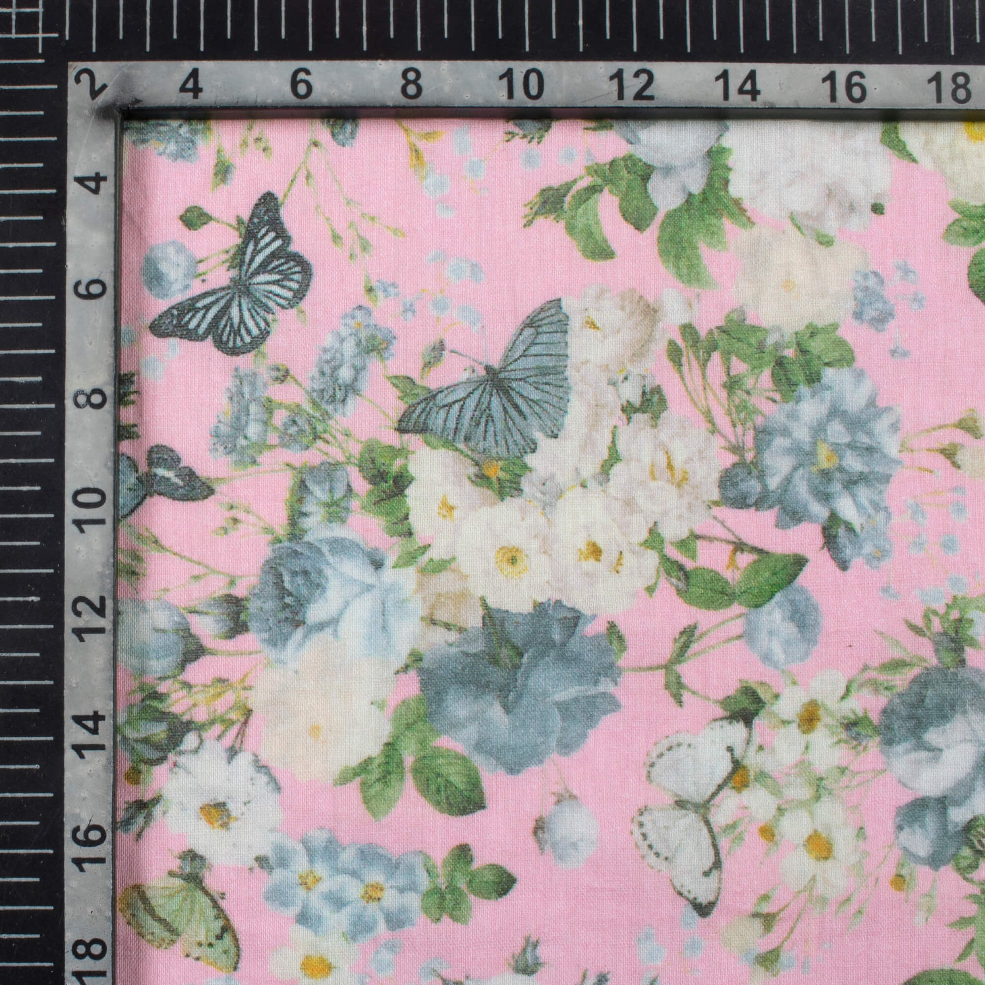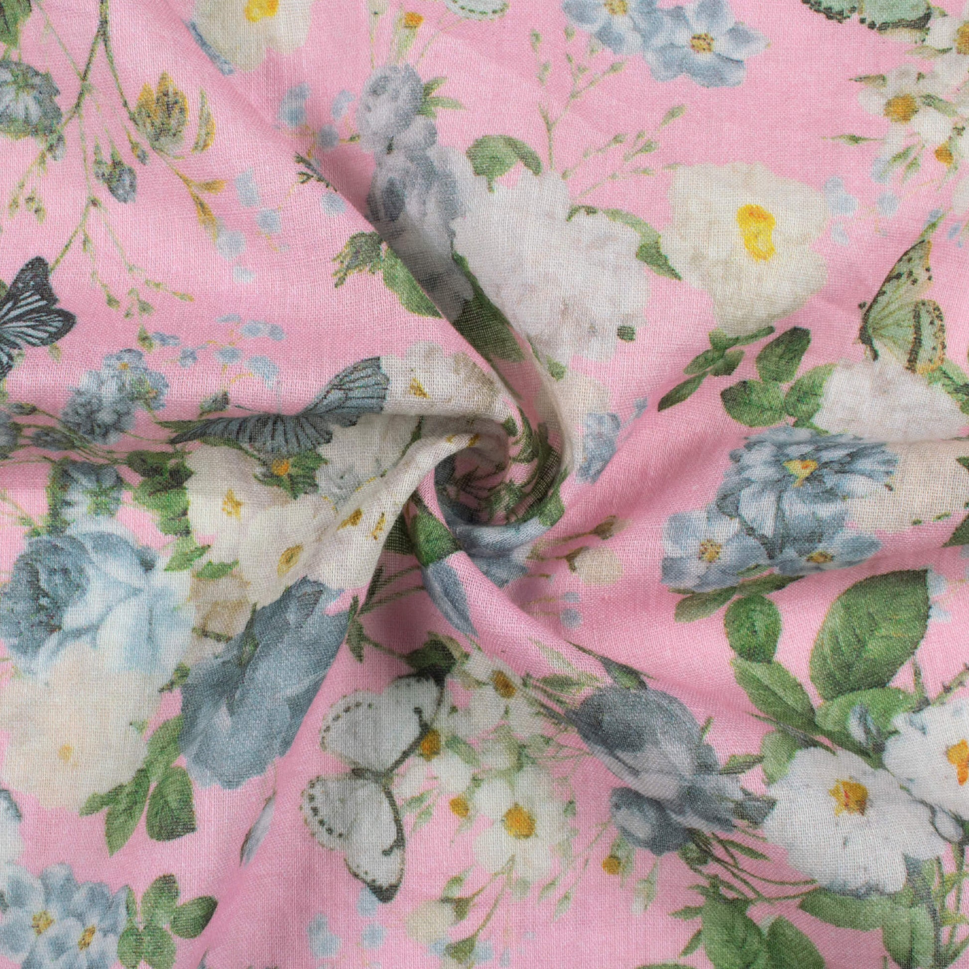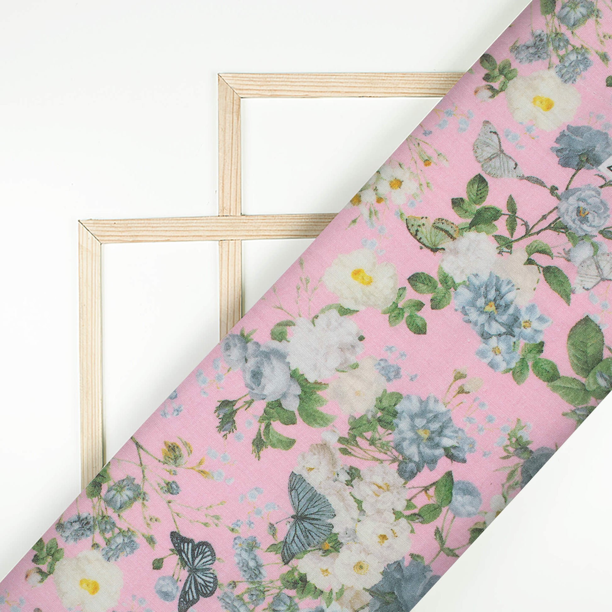 Carnation Pink And Green Floral Pattern Digital Print Pure Cotton Mulmul Fabric