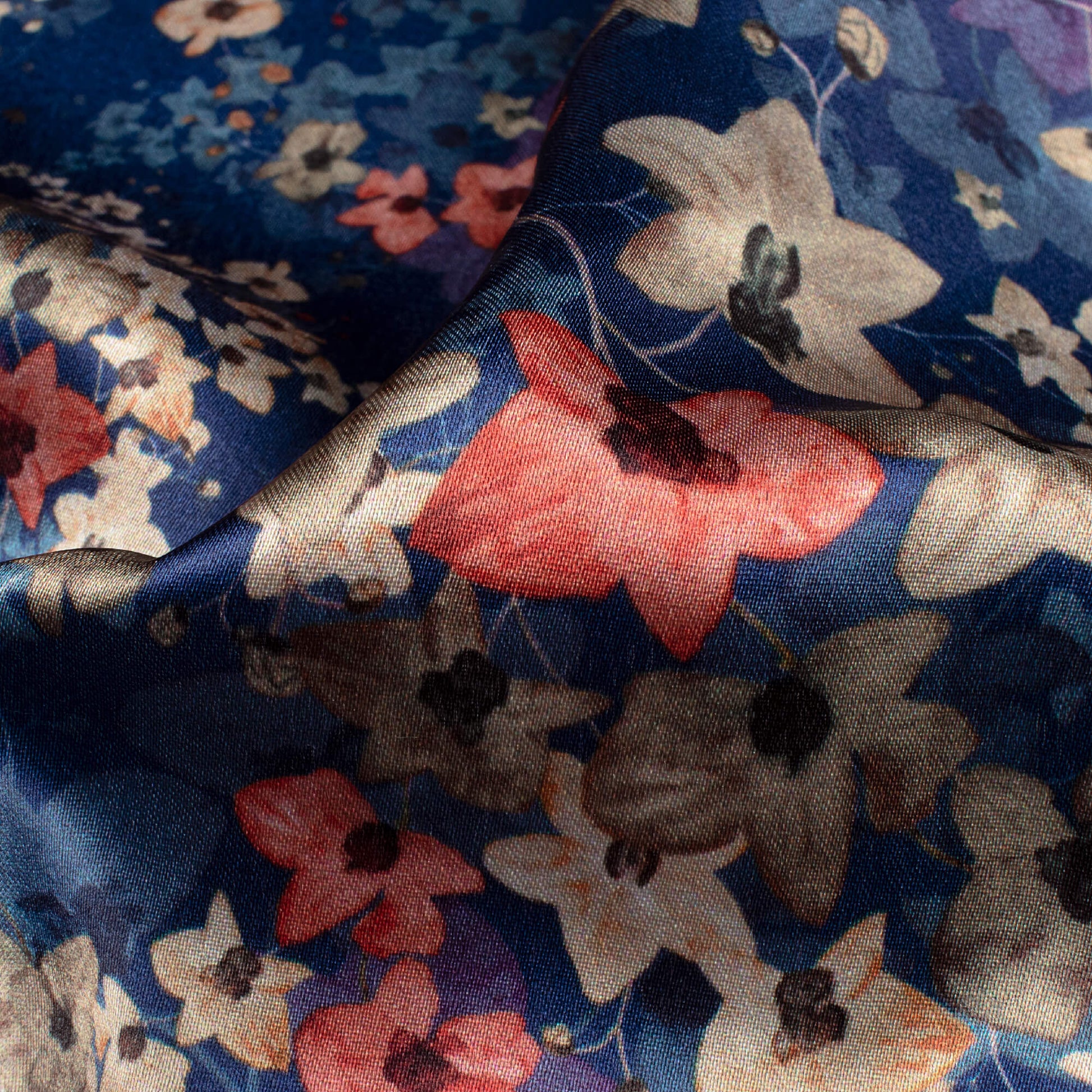 Space Blue And Tortilla Brown Floral Pattern Digital Print Japan Satin Fabric