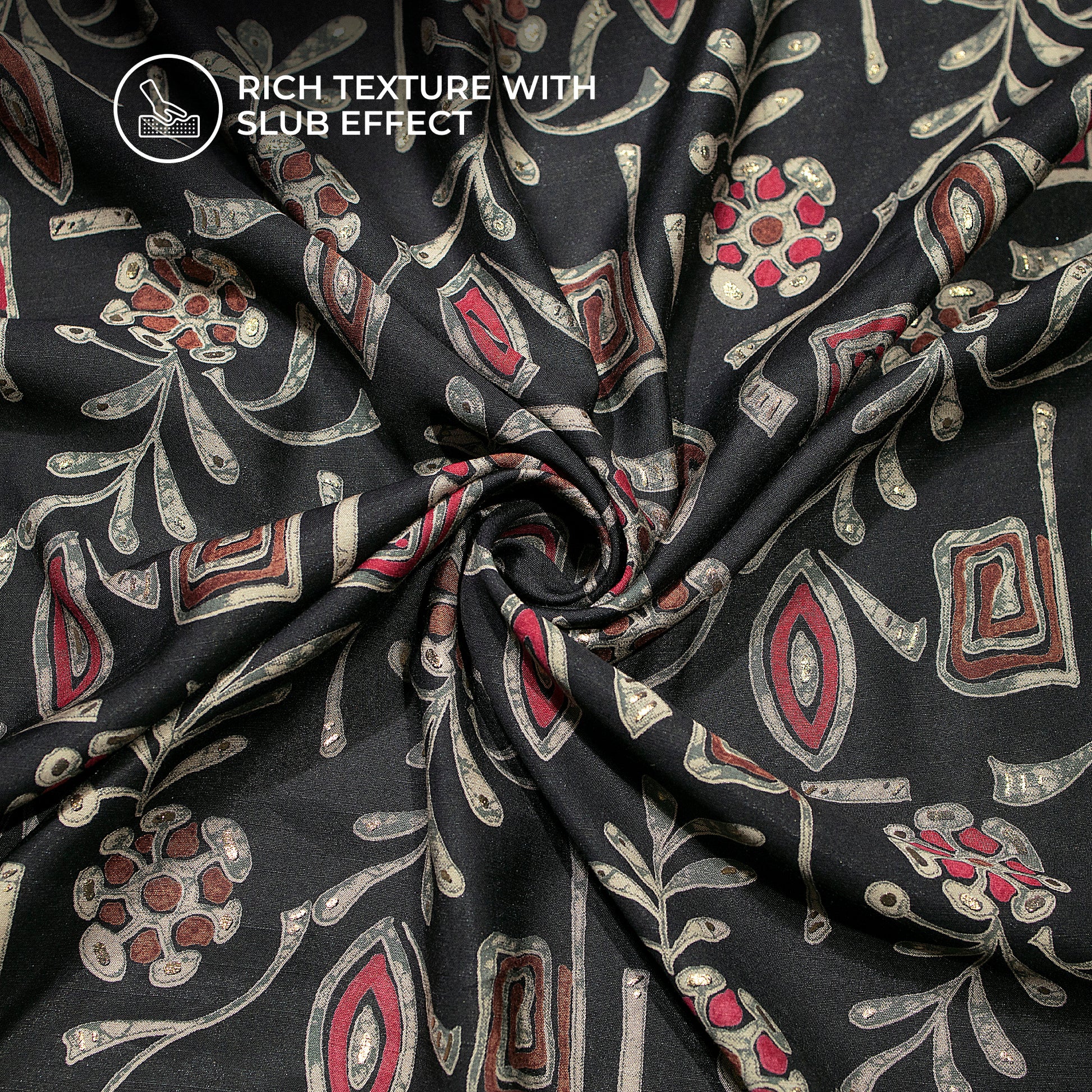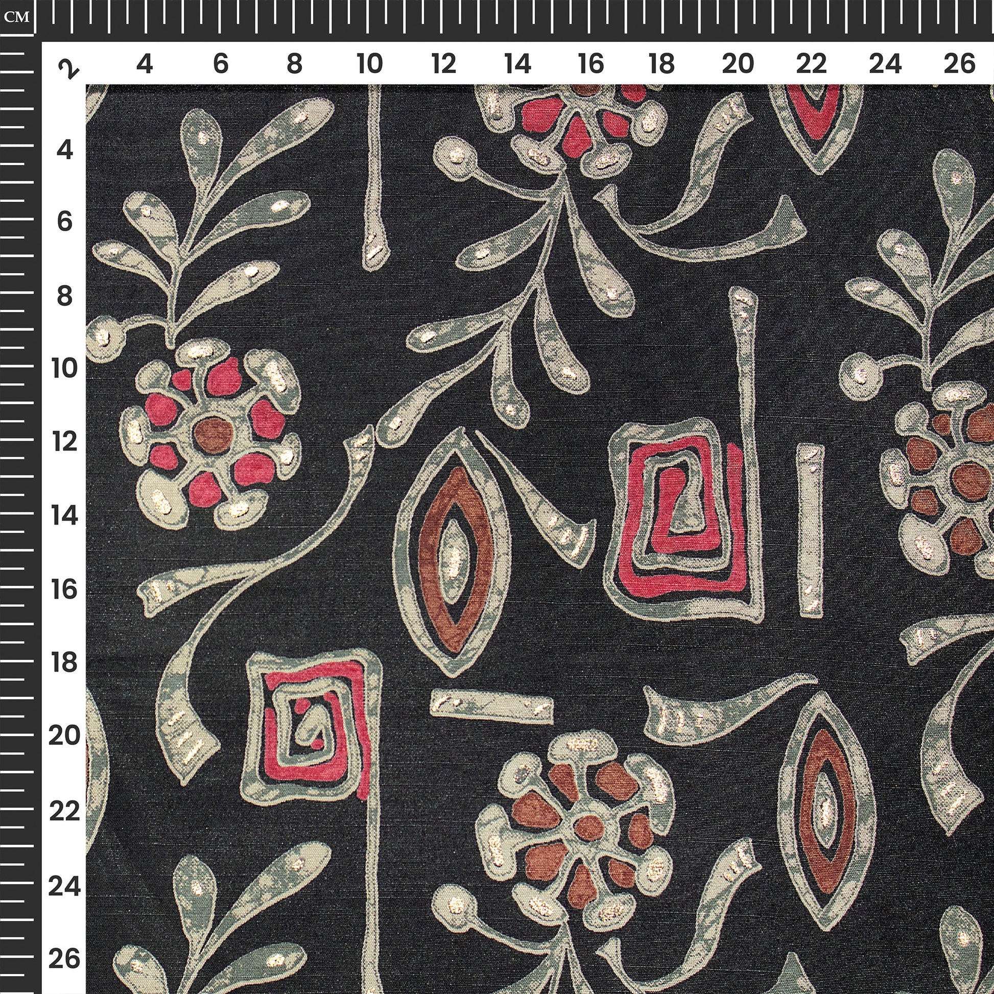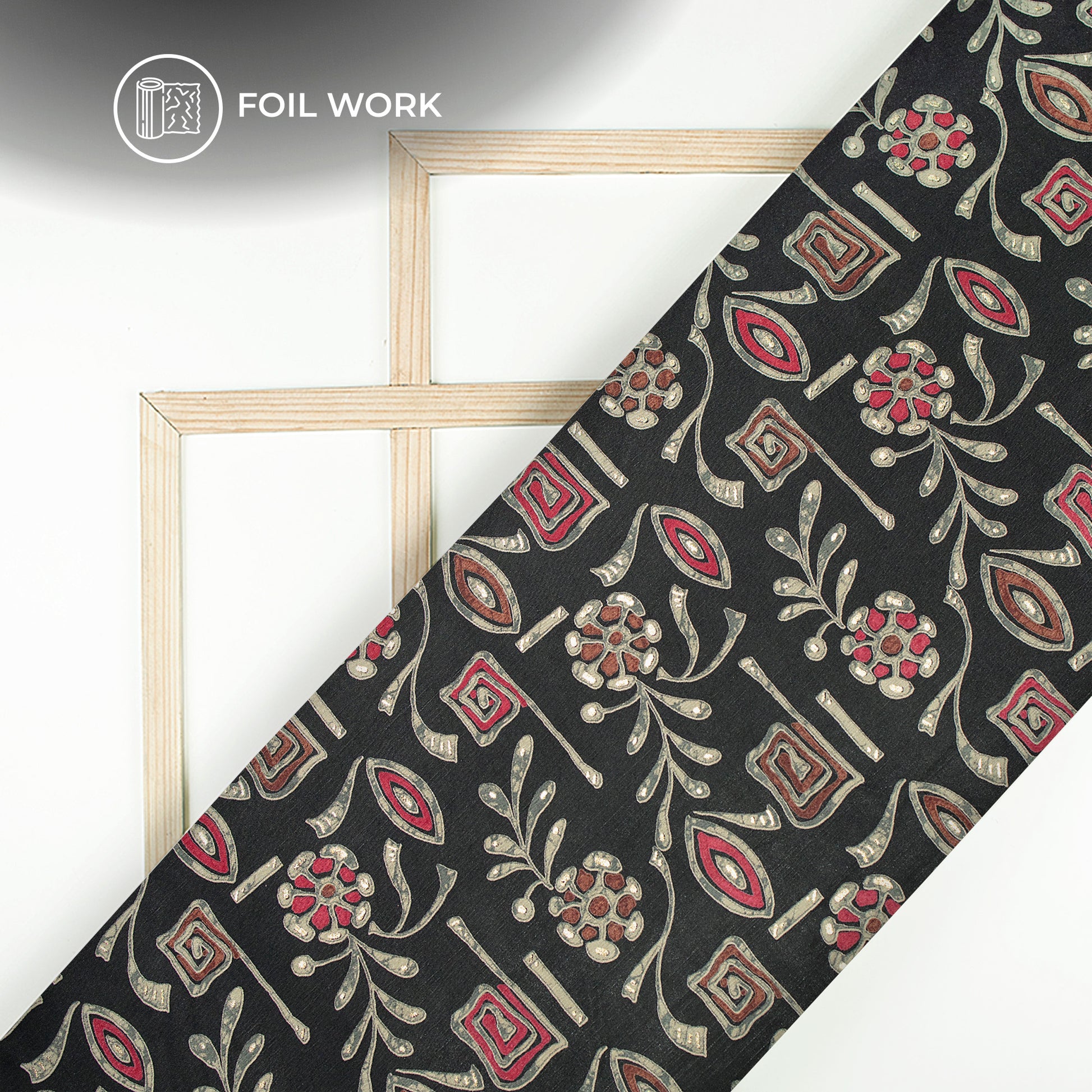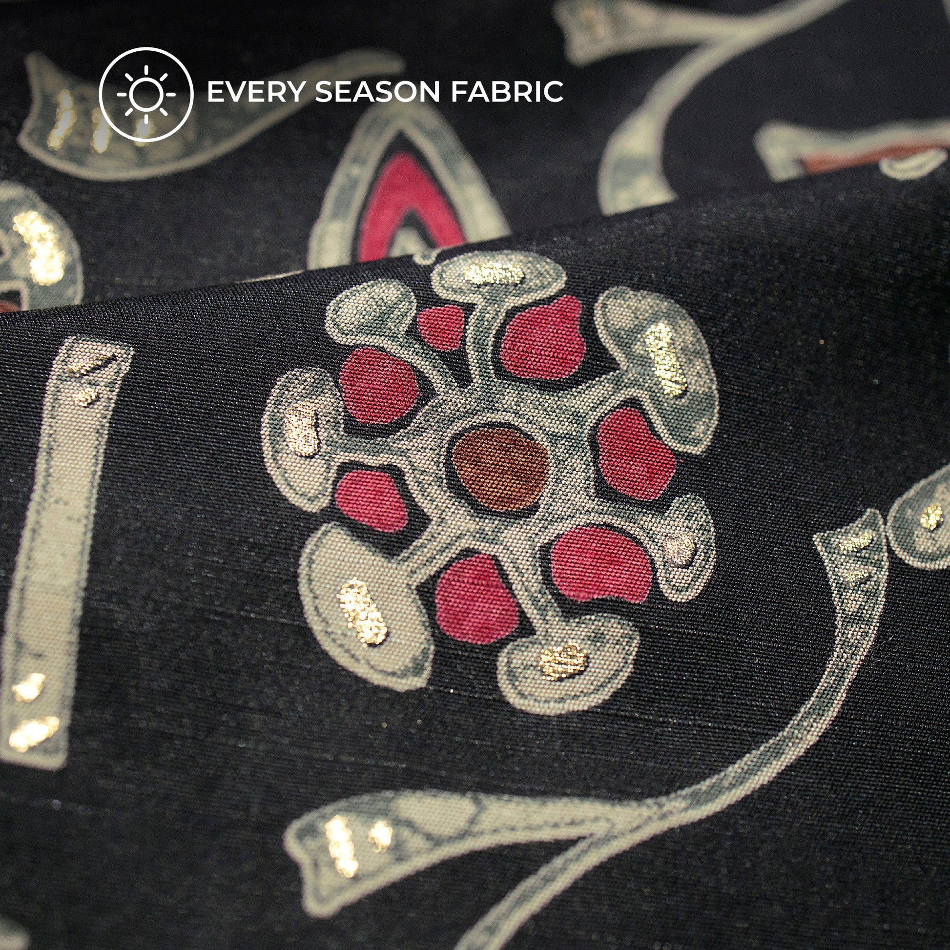 Dark Brown Floral Gold Foil Work Royal Slub Silk Fabric