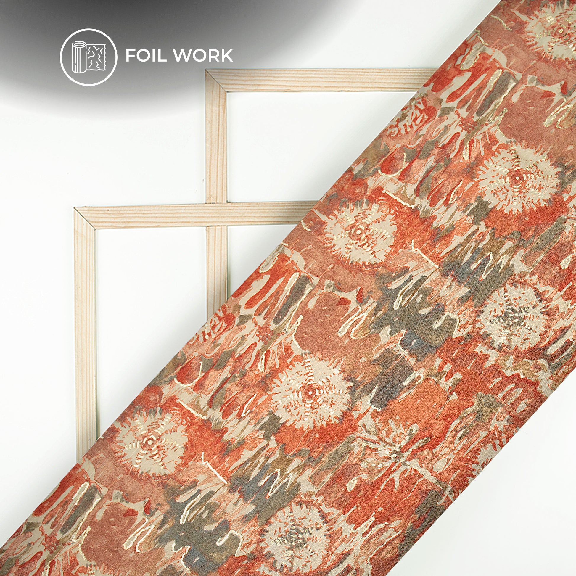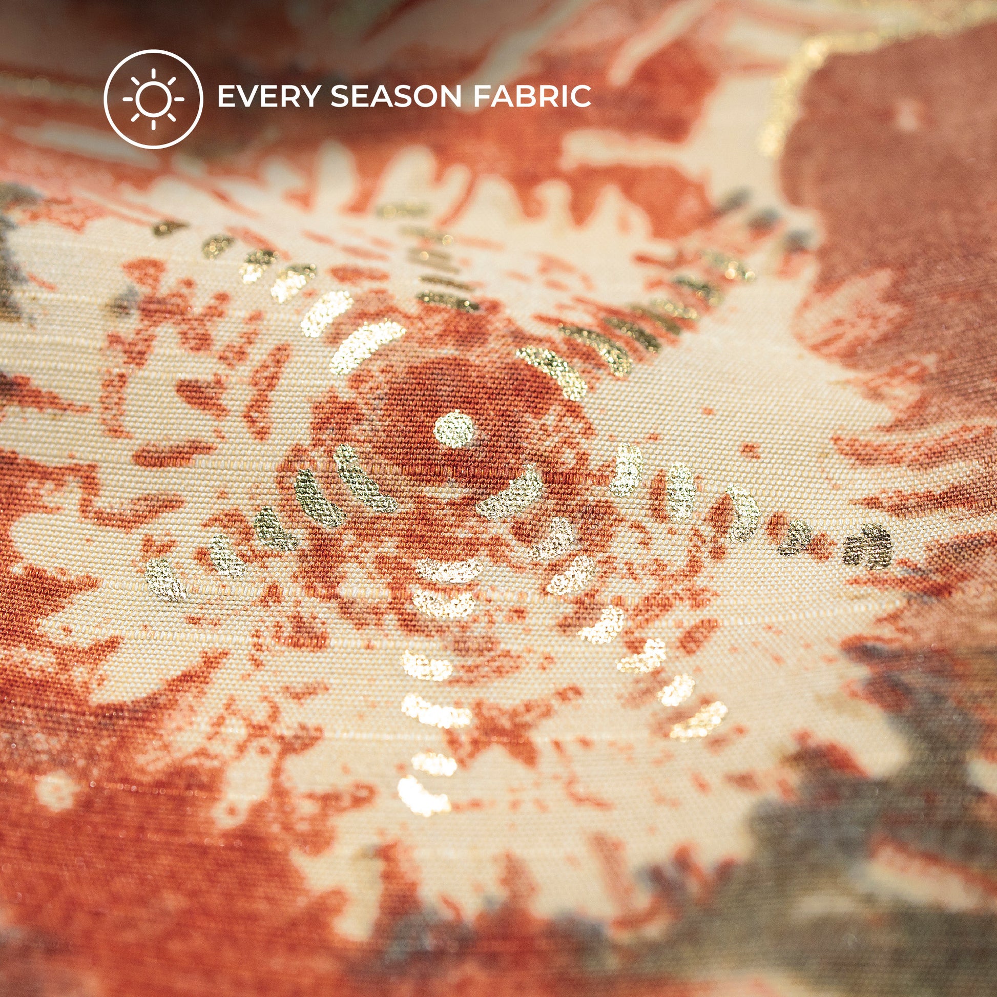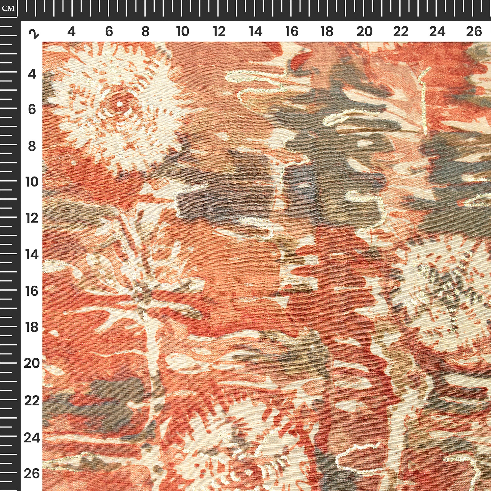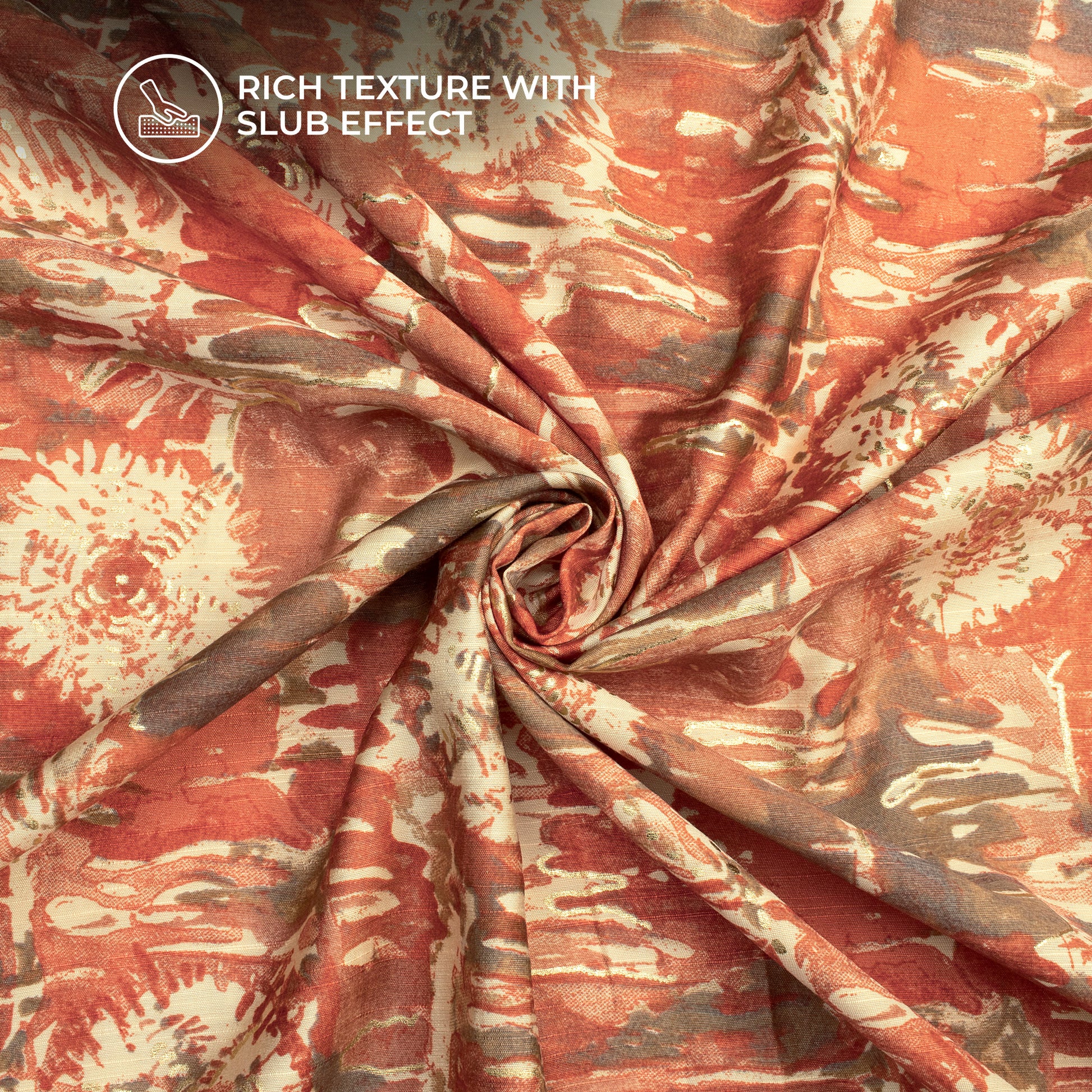 Vermillion Orange Floral Gold Foil Work Royal Slub Silk Fabric
