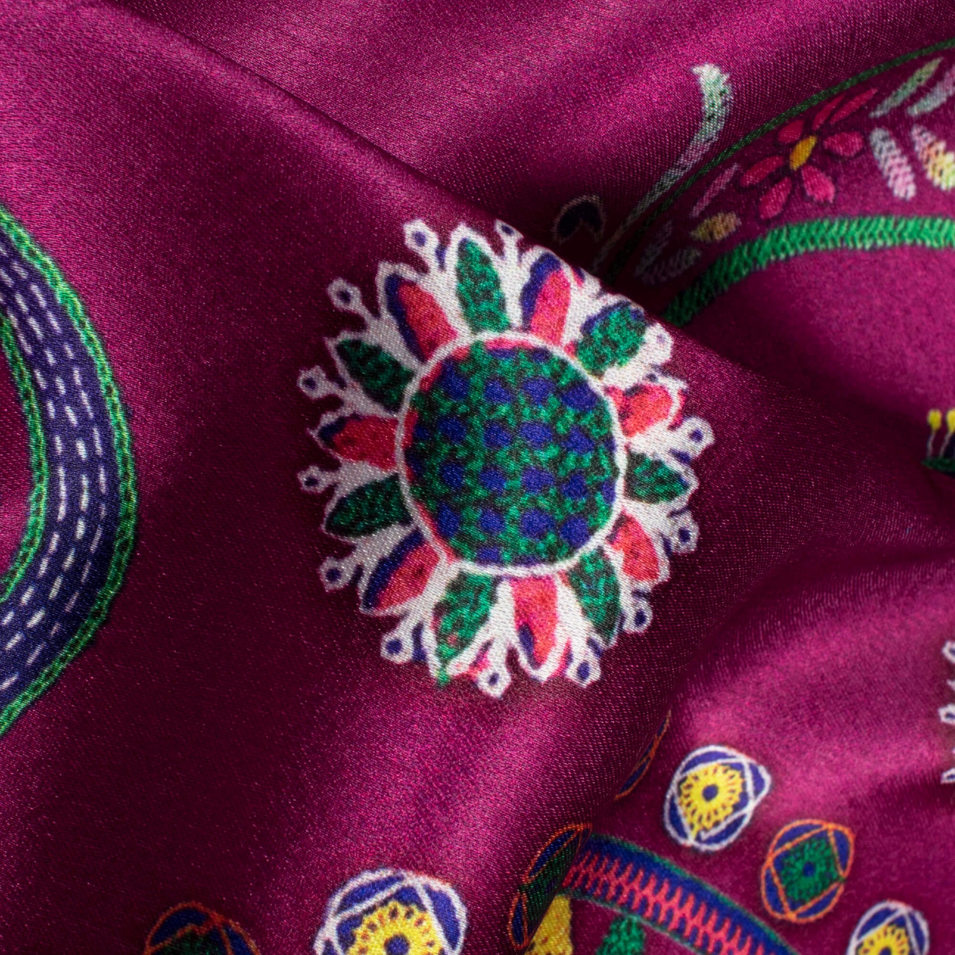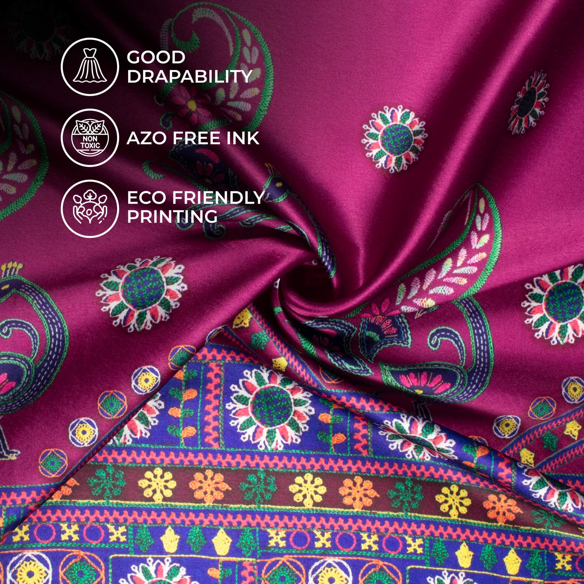Wine Purple And Navy Blue Gamthee Pattern Digital Print Japan Satin Fabric
