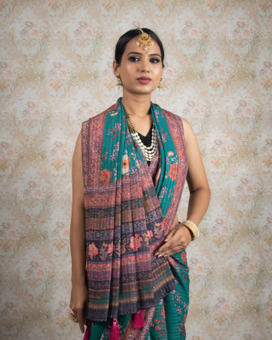 Deep Teal Green And Red Floral Pattern Digital Print Crepe Silk Saree With Printed Silk Border Deep Teal Green And Red Floral Pattern Digital Print Crepe Silk Saree With Printed Silk Border