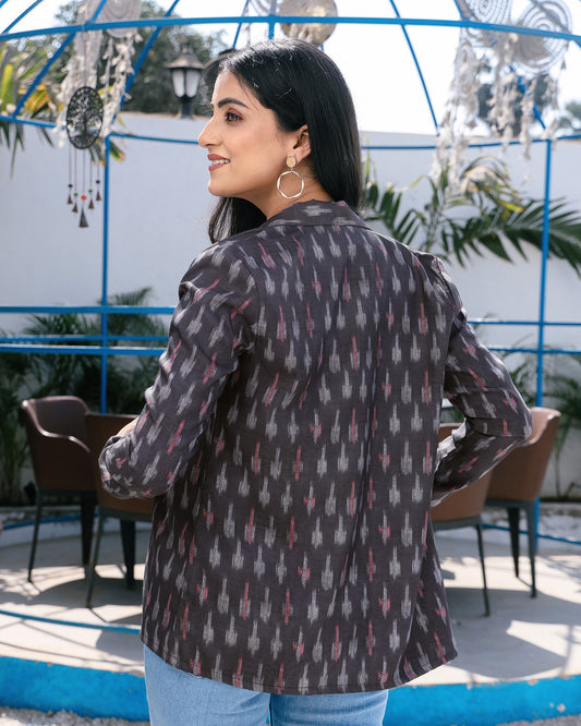 Unveil Artistry in Our Ikkat Pattern Women's Crop Jacket Unveil Artistry in Our Ikkat Pattern Women's Crop Jacket
