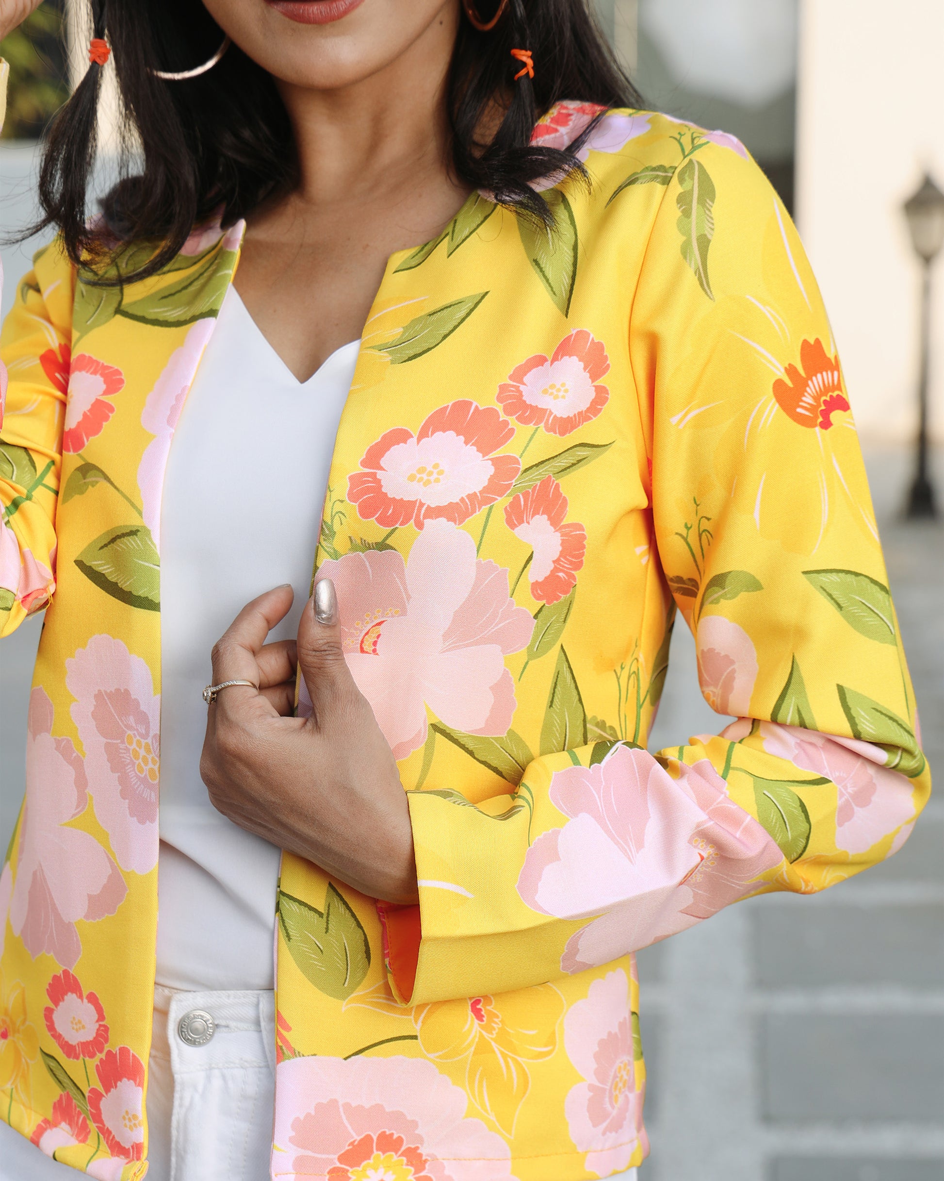 DescriptionDescriptionSomething new and exciting is here to mark an impression. Designer jackets in vivid colors bring out the best in you for every special occasion. Easy to maintain and easy to wear. Pair it up with trousers or even denim and it will make you look extra-ordinary. You can wear these jackets at wedding functions, parties, outings with friends, and more. Material Rayon ColorYellow Neck TypeRound Neck Sleeve TypeFull Sleeve Fit Type