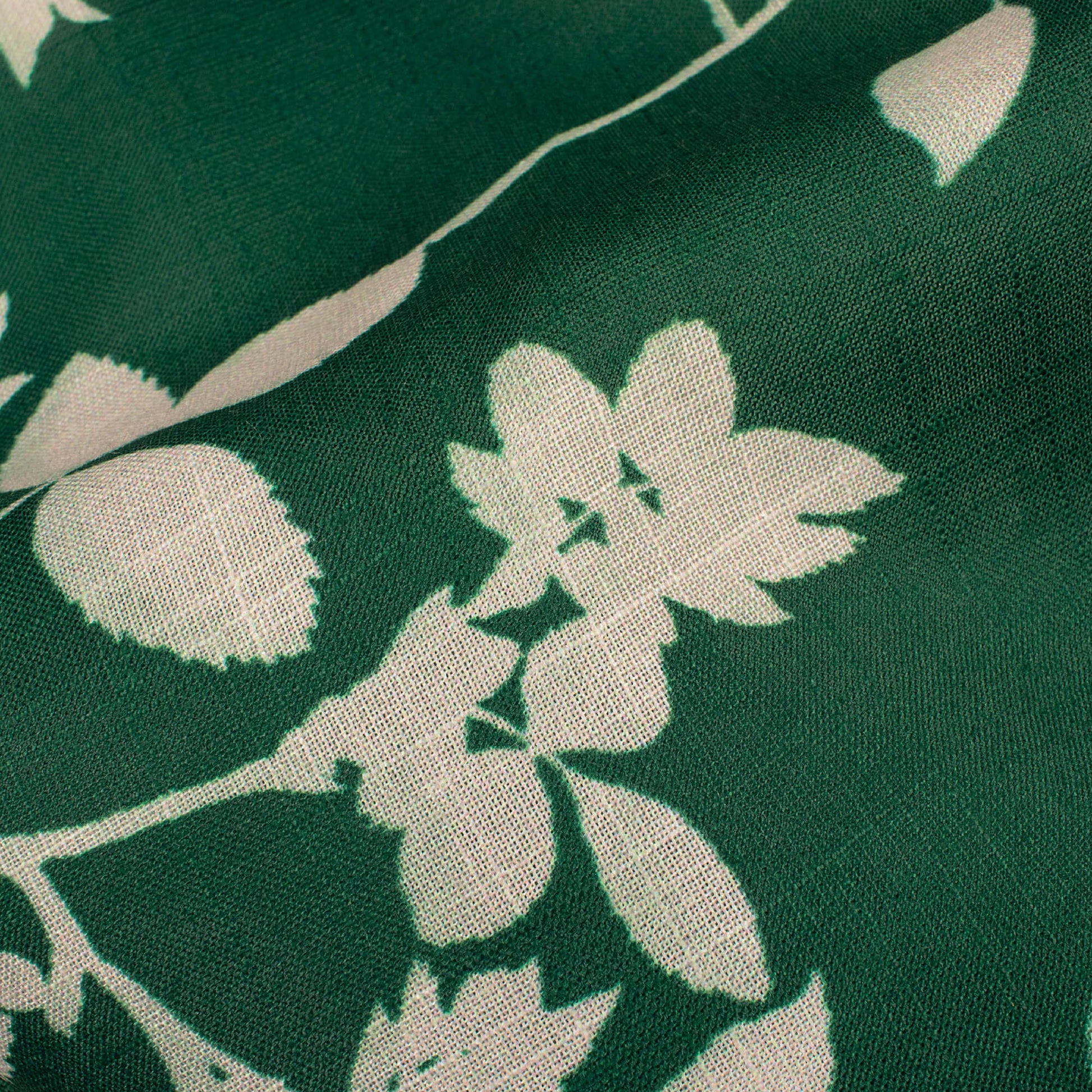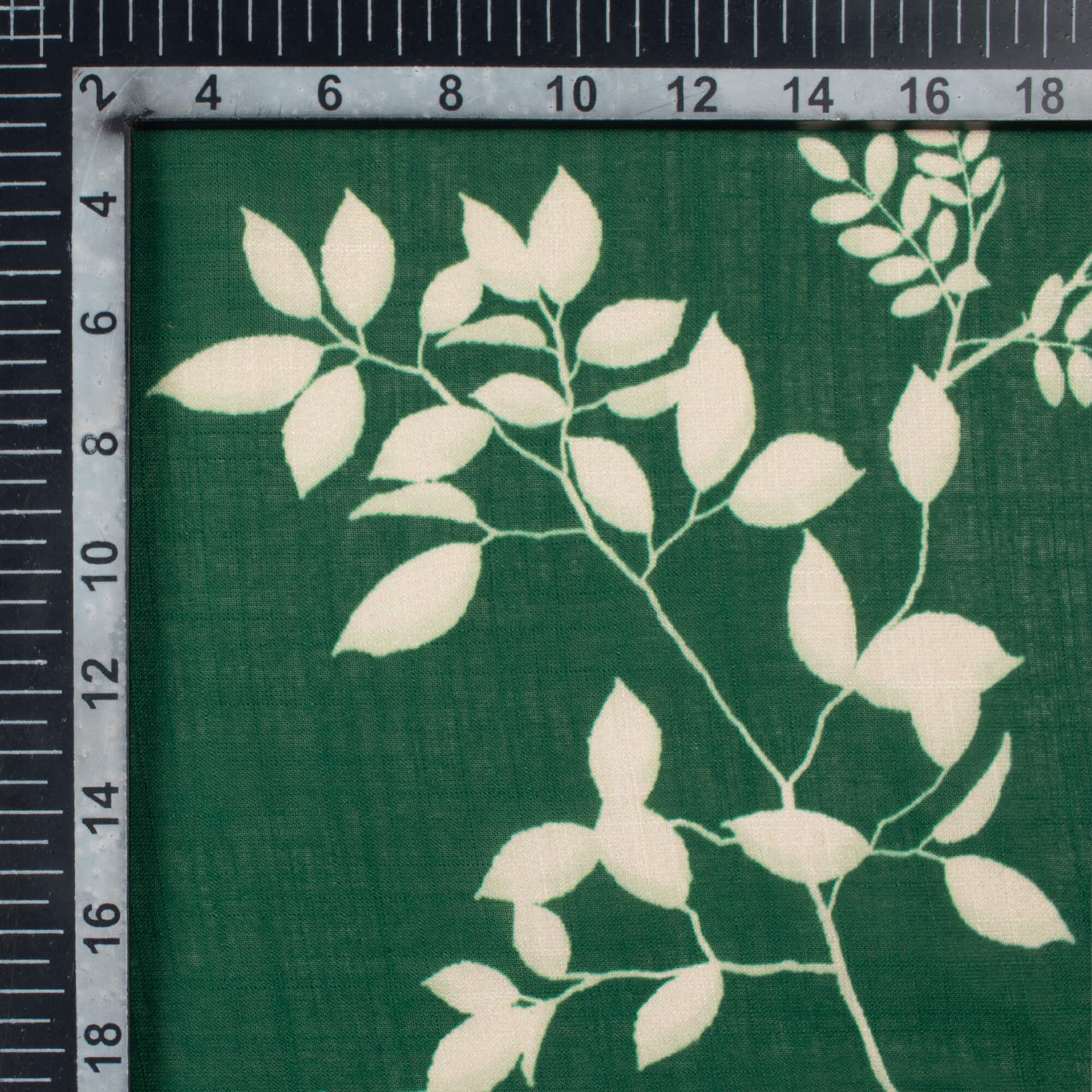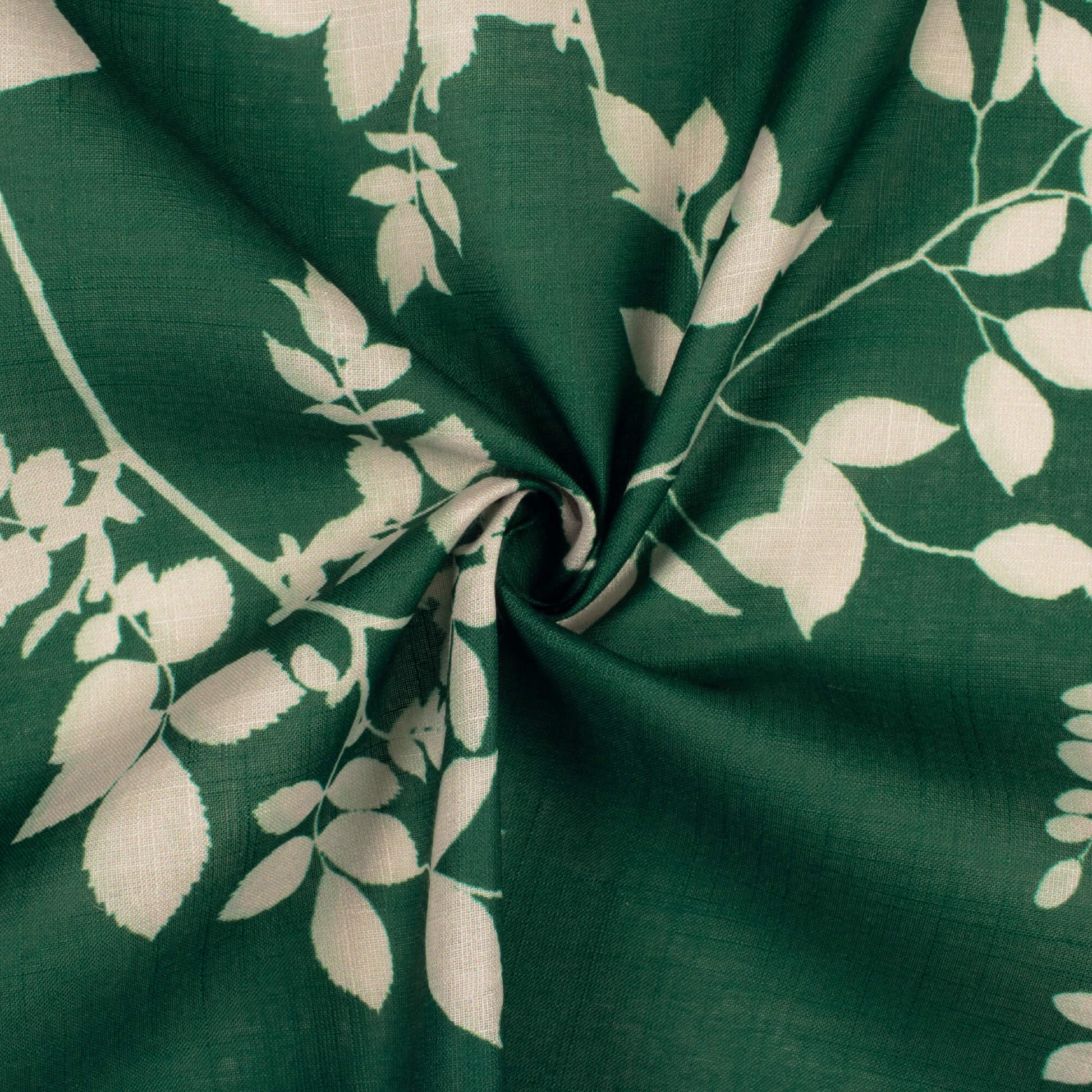 Bottle Green And Beige Leaf Pattern Digital Print Poly Linen Fabric