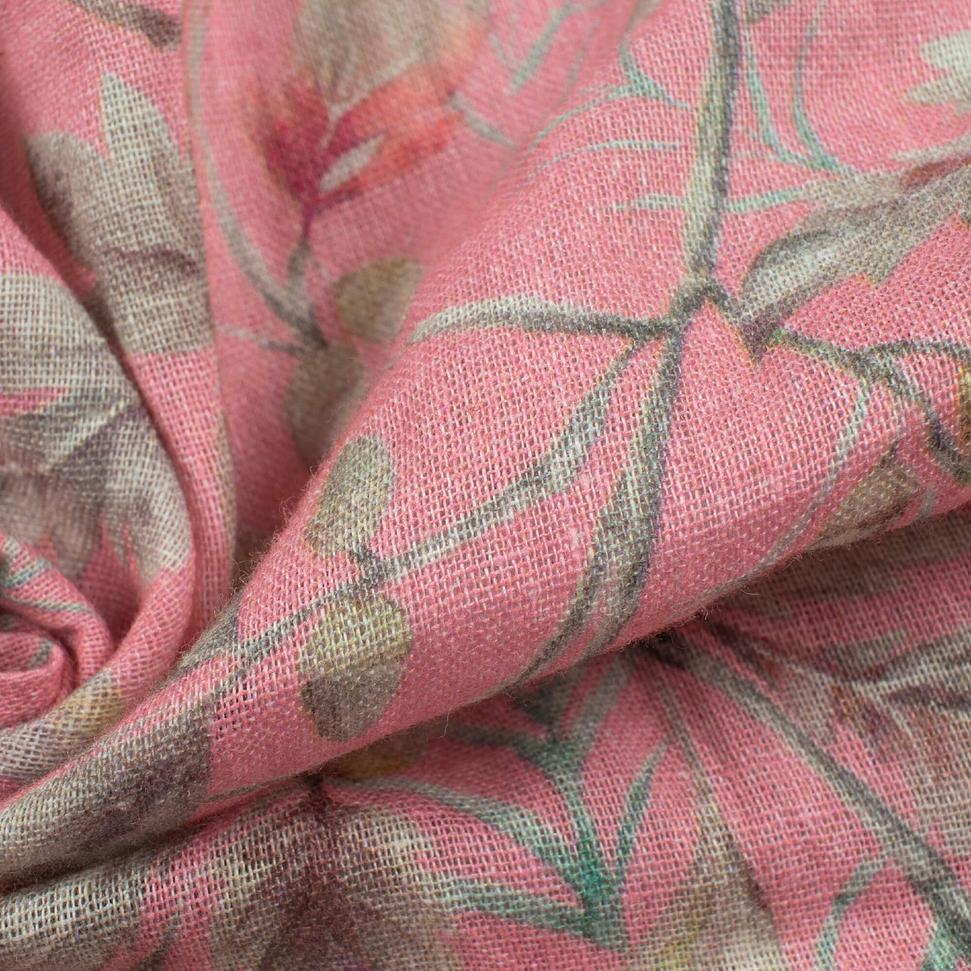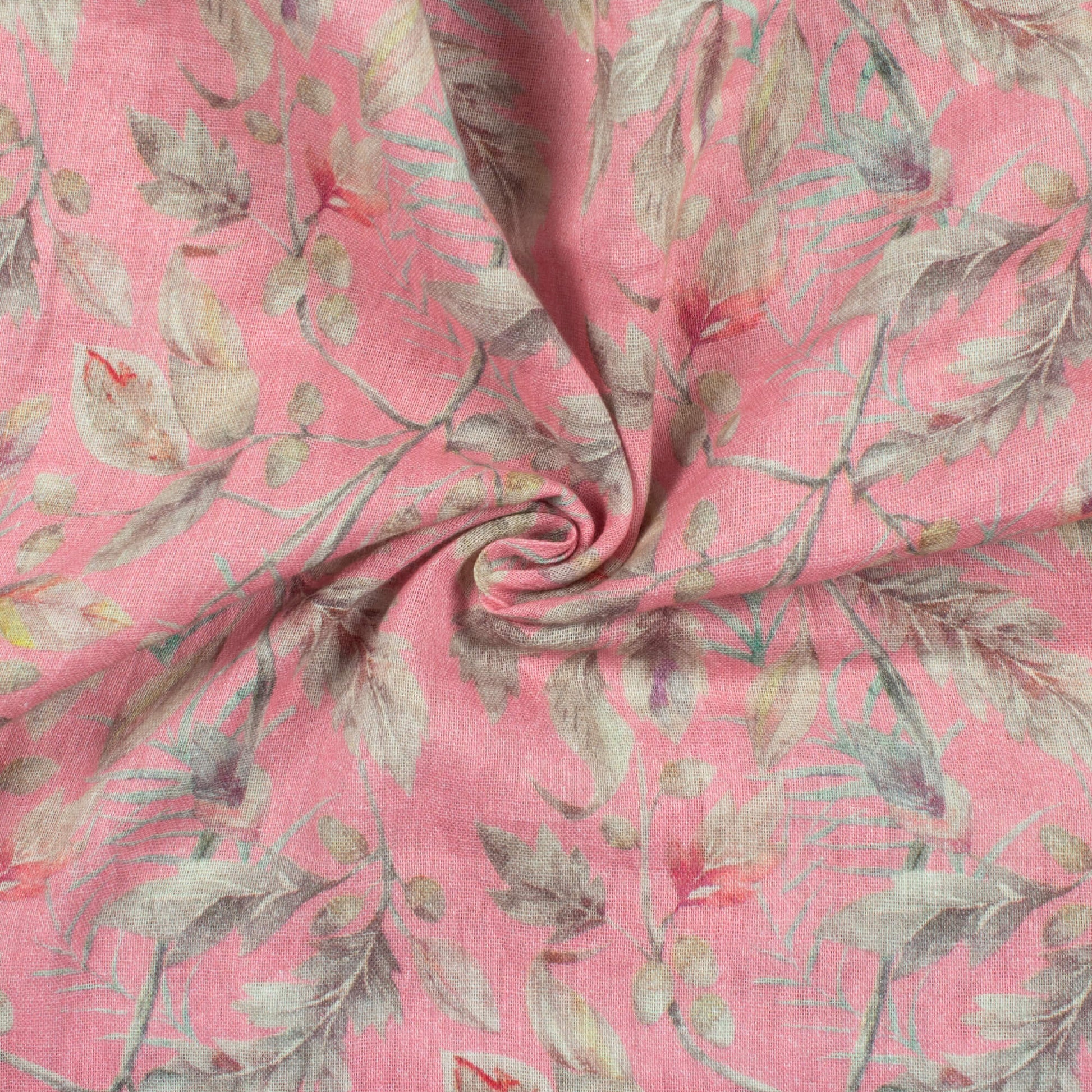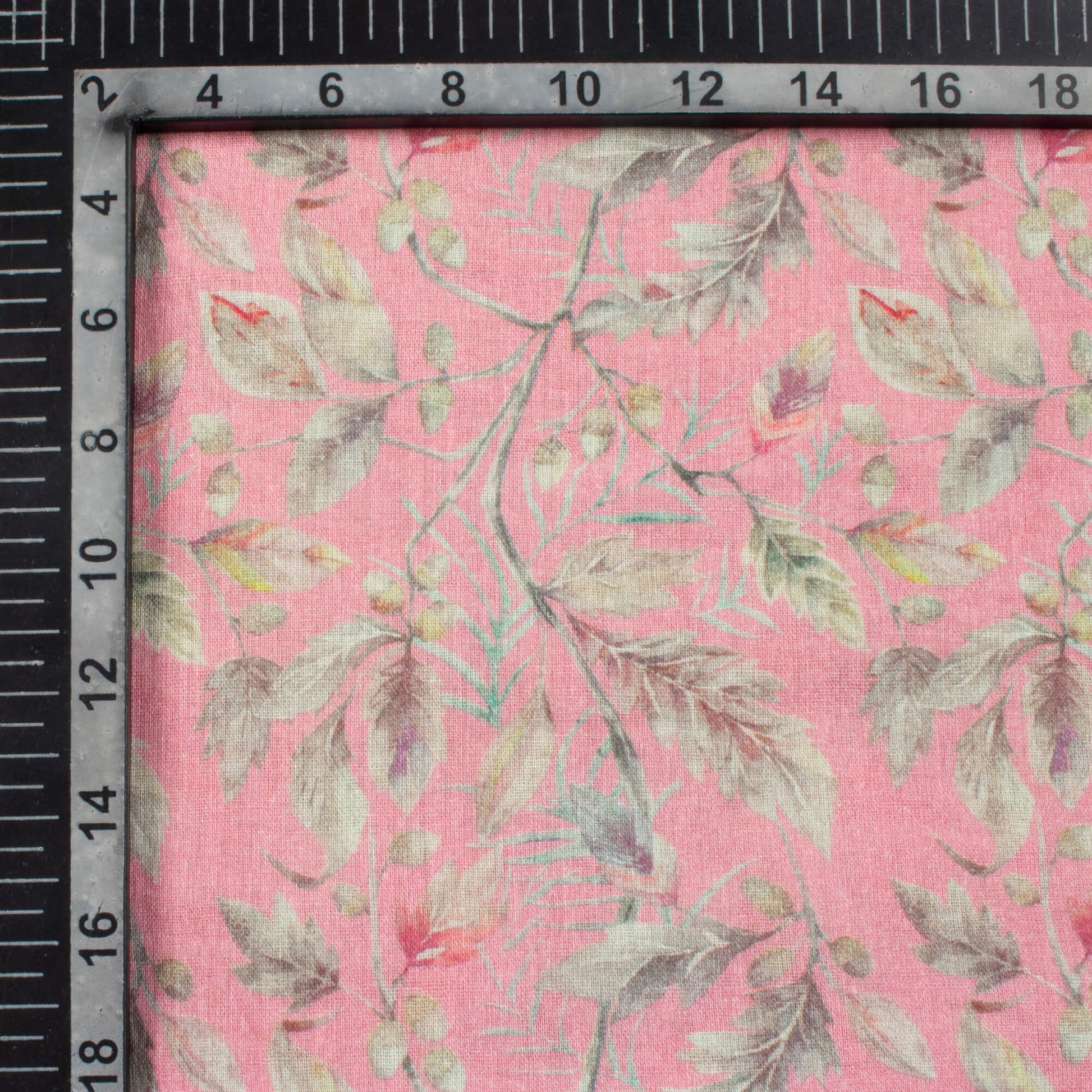 Carnation Pink And Dolphin Grey Leaf Pattern Digital Print Pure Cotton Mulmul Fabric