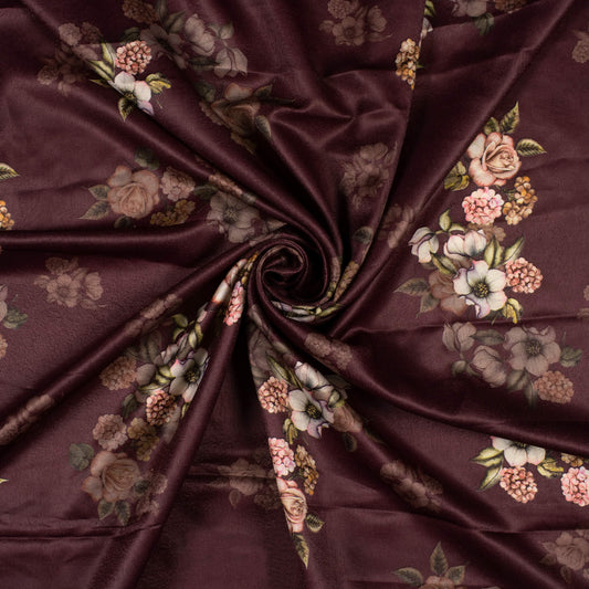 Chocolate Brown And Pink Floral Pattern Digital Print Premium Lush Satin Fabric Chocolate Brown And Pink Floral Pattern Digital Print Premium Lush Satin Fabric