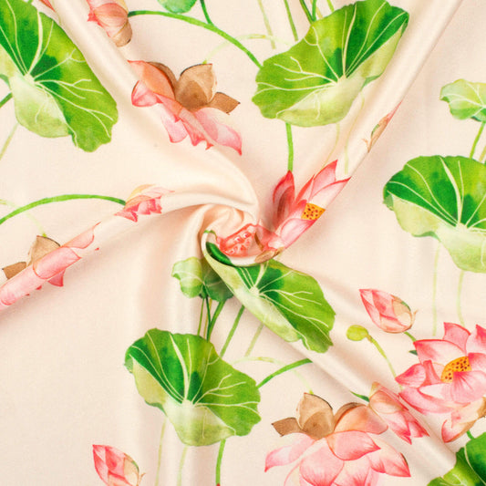 Ivory Cream And Lotus Pink Floral Pattern Digital Print Lush Satin Fabric Ivory Cream And Lotus Pink Floral Pattern Digital Print Lush Satin Fabric