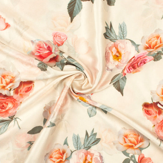 Cream And Pink Floral Pattern Digital Print Lush Satin Fabric Cream And Pink Floral Pattern Digital Print Lush Satin Fabric