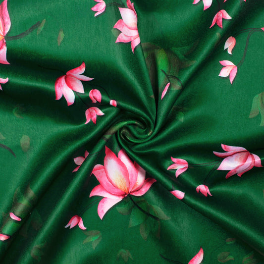 Lotus Pink And Kelly Green Floral Pattern Digital Print Lush Satin Fabric Lotus Pink And Kelly Green Floral Pattern Digital Print Lush Satin Fabric