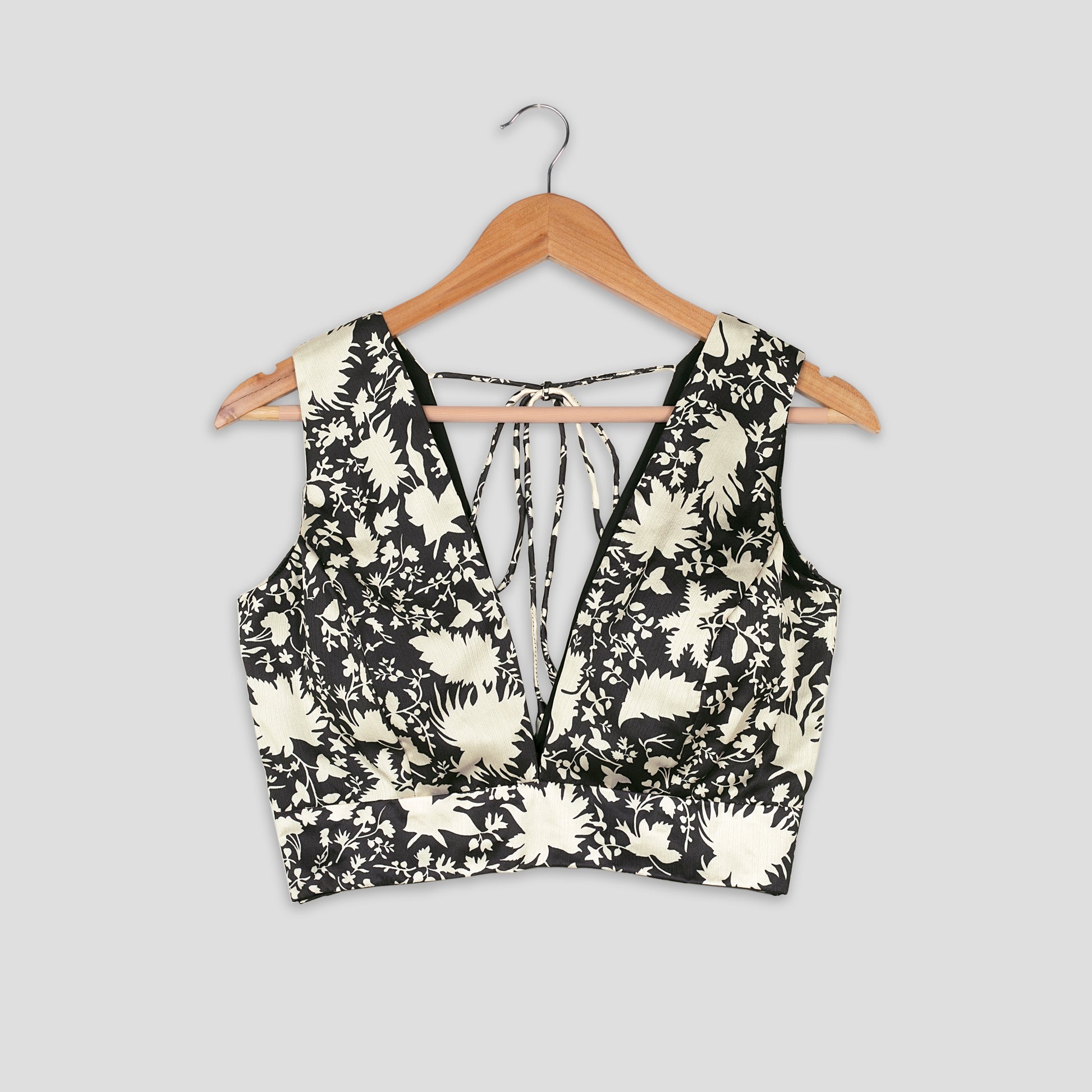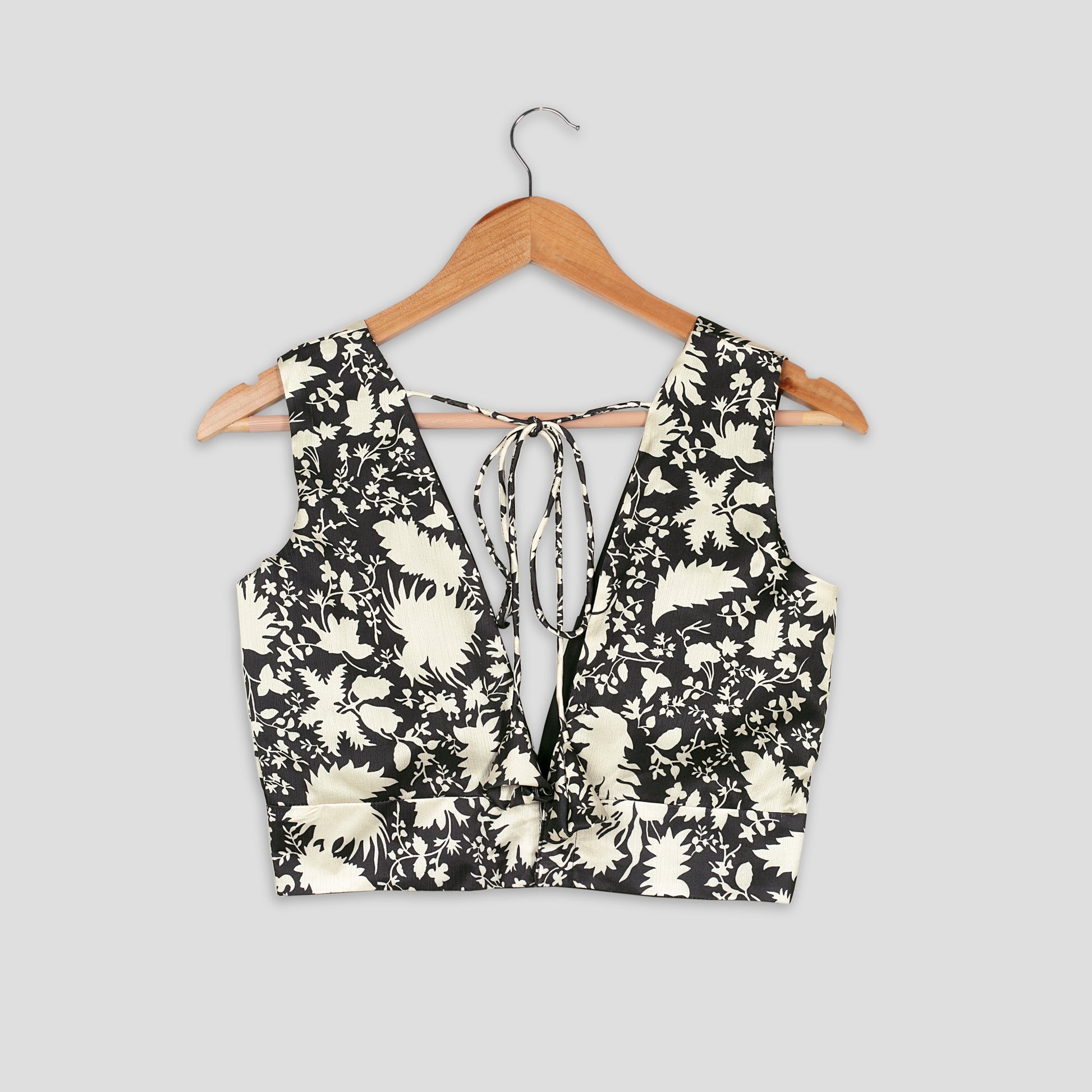 This elegant blouse features a V-neck and sleeveless design, with a beautiful floral print and attractive border. This blouse is the perfect choice for any occasion and offers both style and comfort. Expertly crafted for a flattering fit, this top will elevate your wardrobe and keep you looking effortlessly chic.