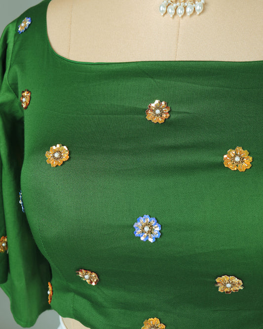 Premium Floral Sequins Hand Work Green Cotton Blouse Premium Floral Sequins Hand Work Green Cotton Blouse