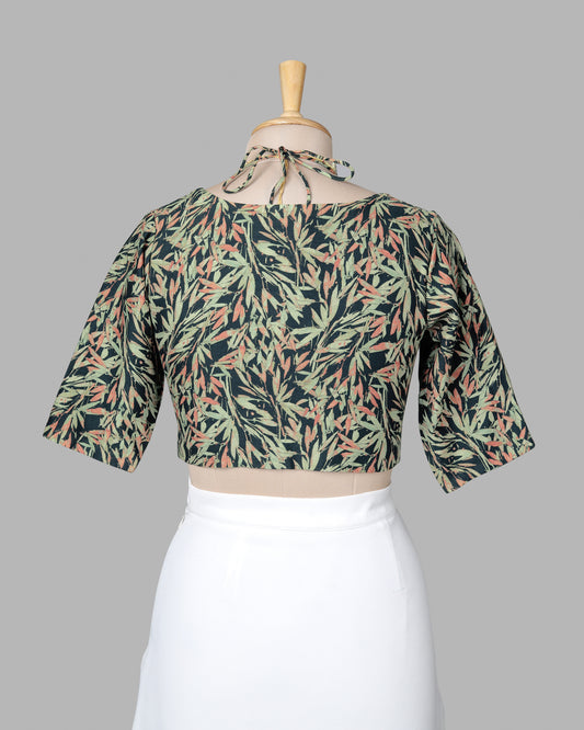 Black And Tea Green Leaf Tie Up Neck Cotton Blouse Black And Tea Green Leaf Tie Up Neck Cotton Blouse