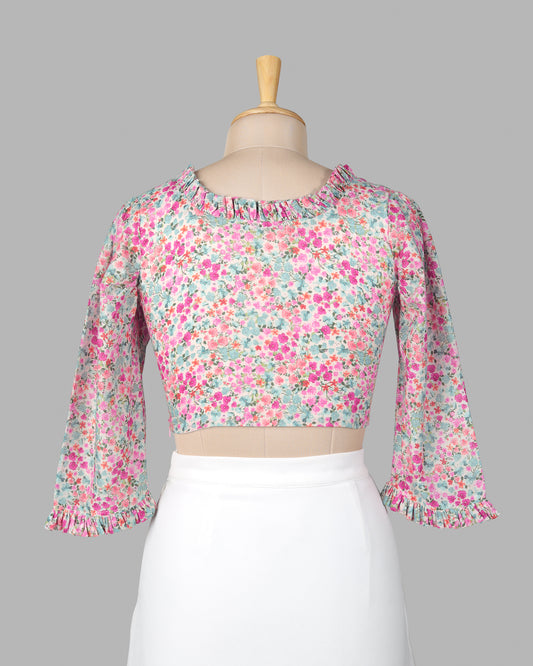 Pink Floral Ruffle Neck Cotton Blouse