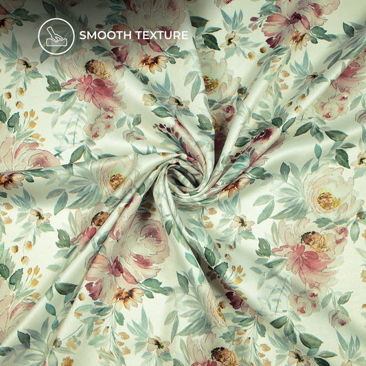Cream Color Vintage Floral Digital Print Lush Satin Fabric Cream Color Vintage Floral Digital Print Lush Satin Fabric