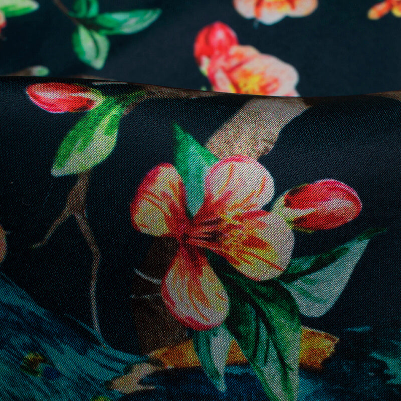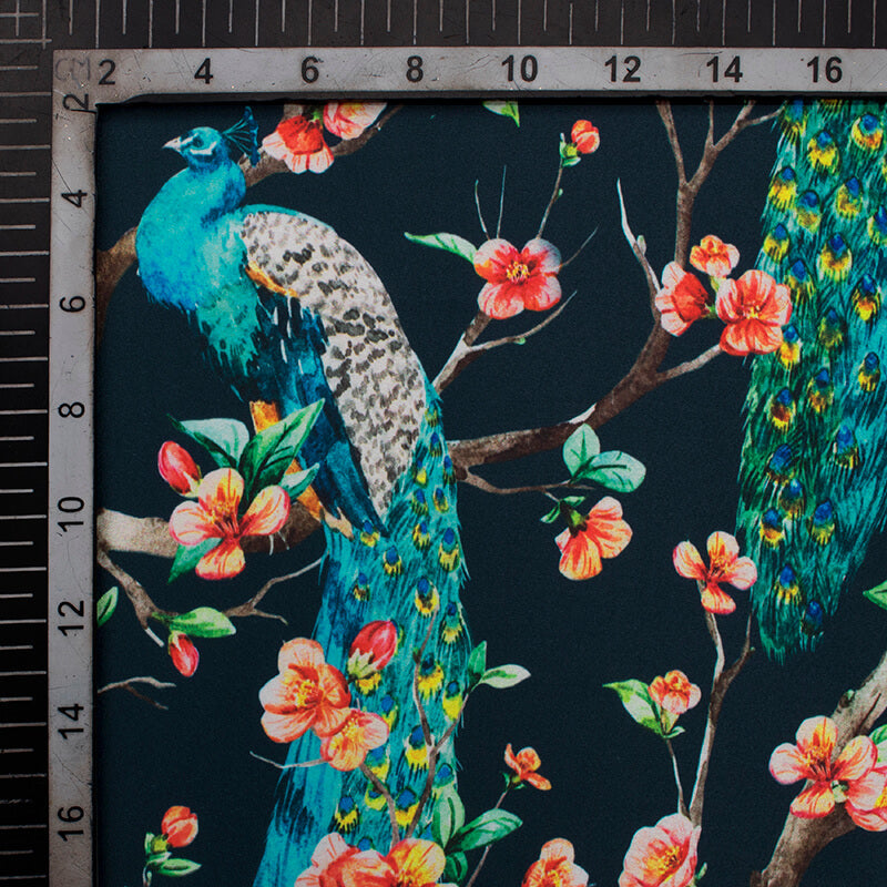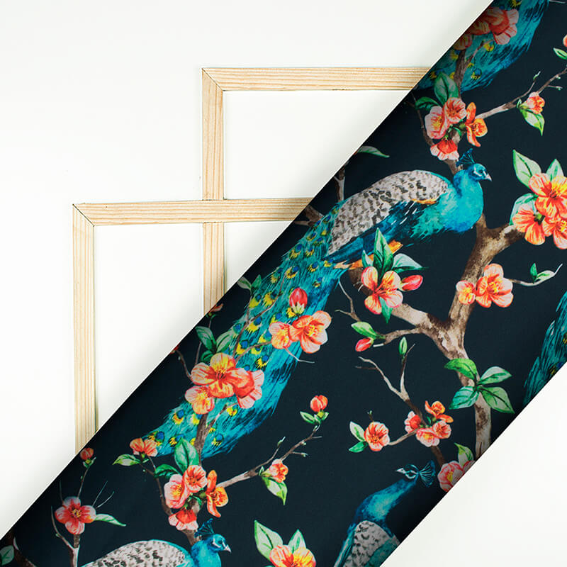 Black And Blue Peacock Pattern Digital Print Japan Satin Fabric
