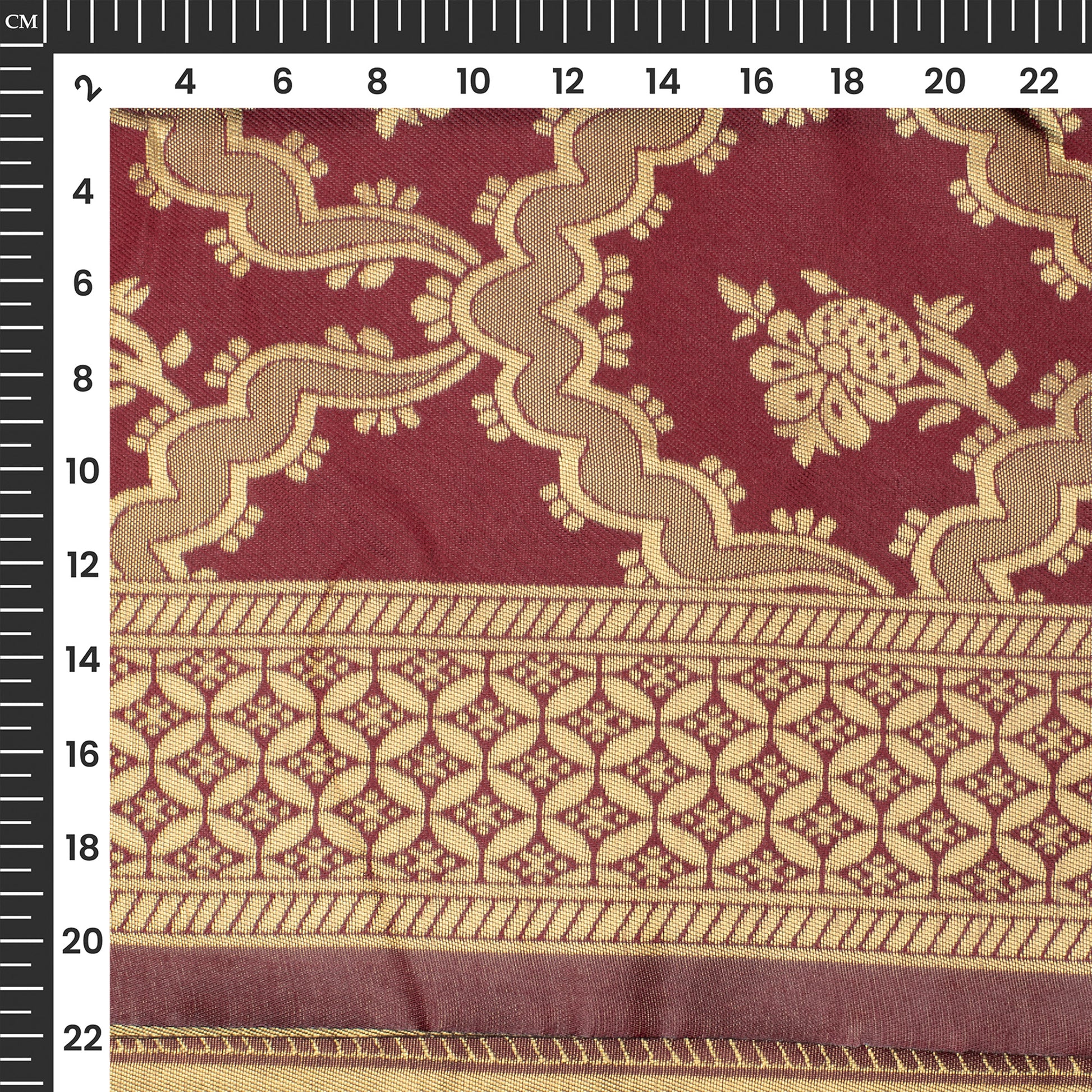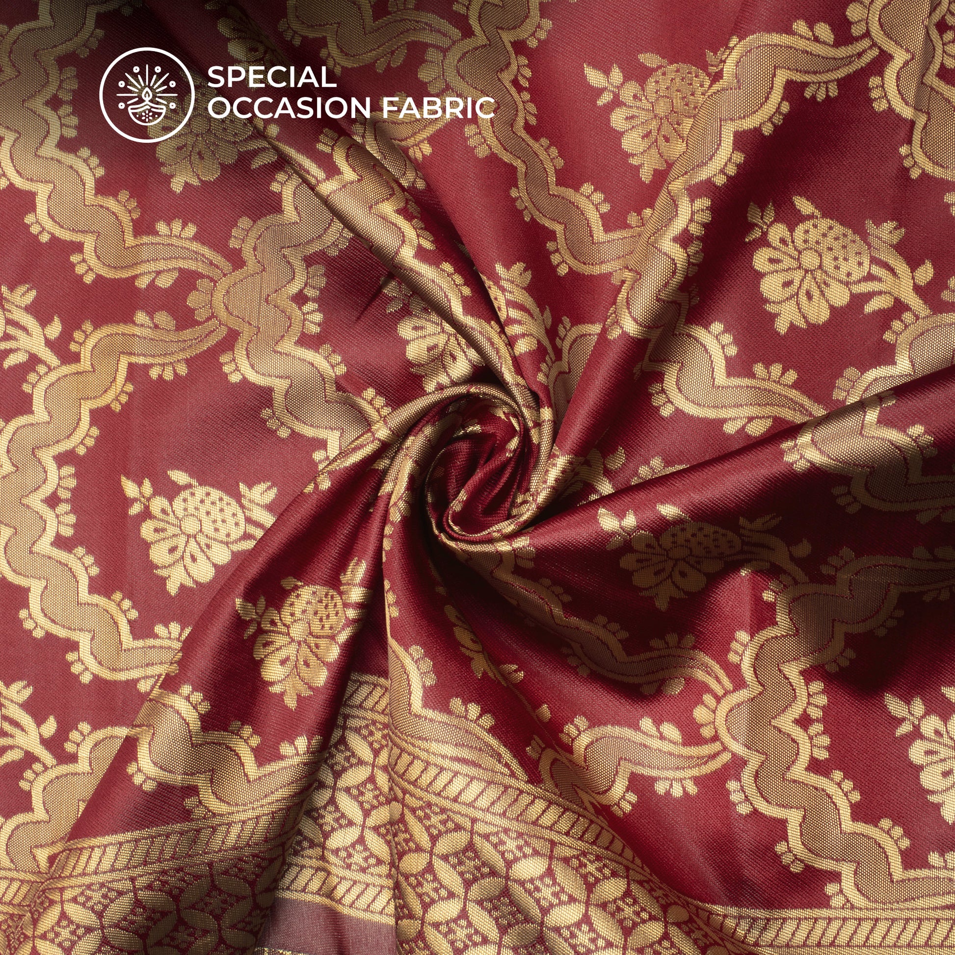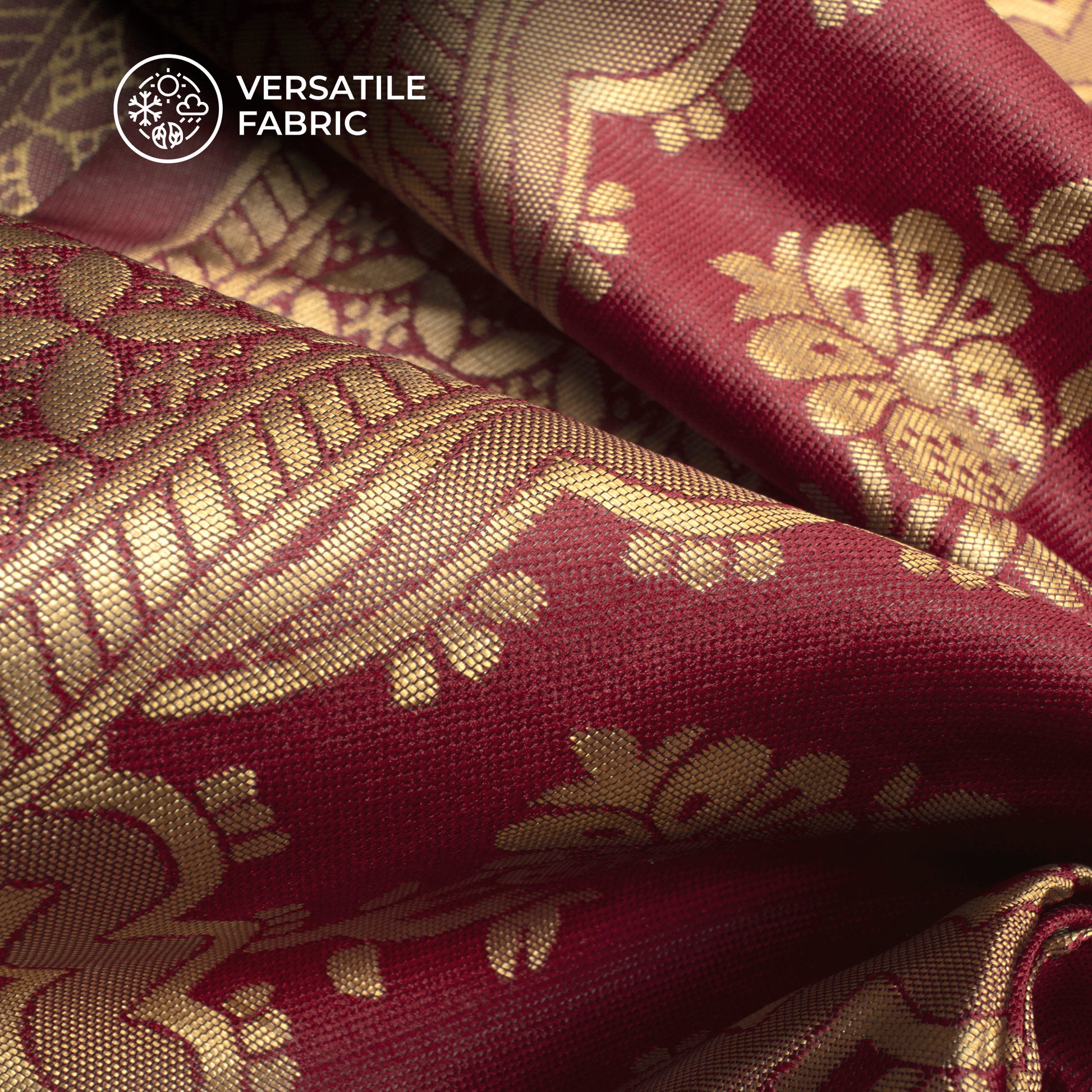 Cherry Red And Golden Floral Zari Jacquard Work Banarasi Silk Fabric