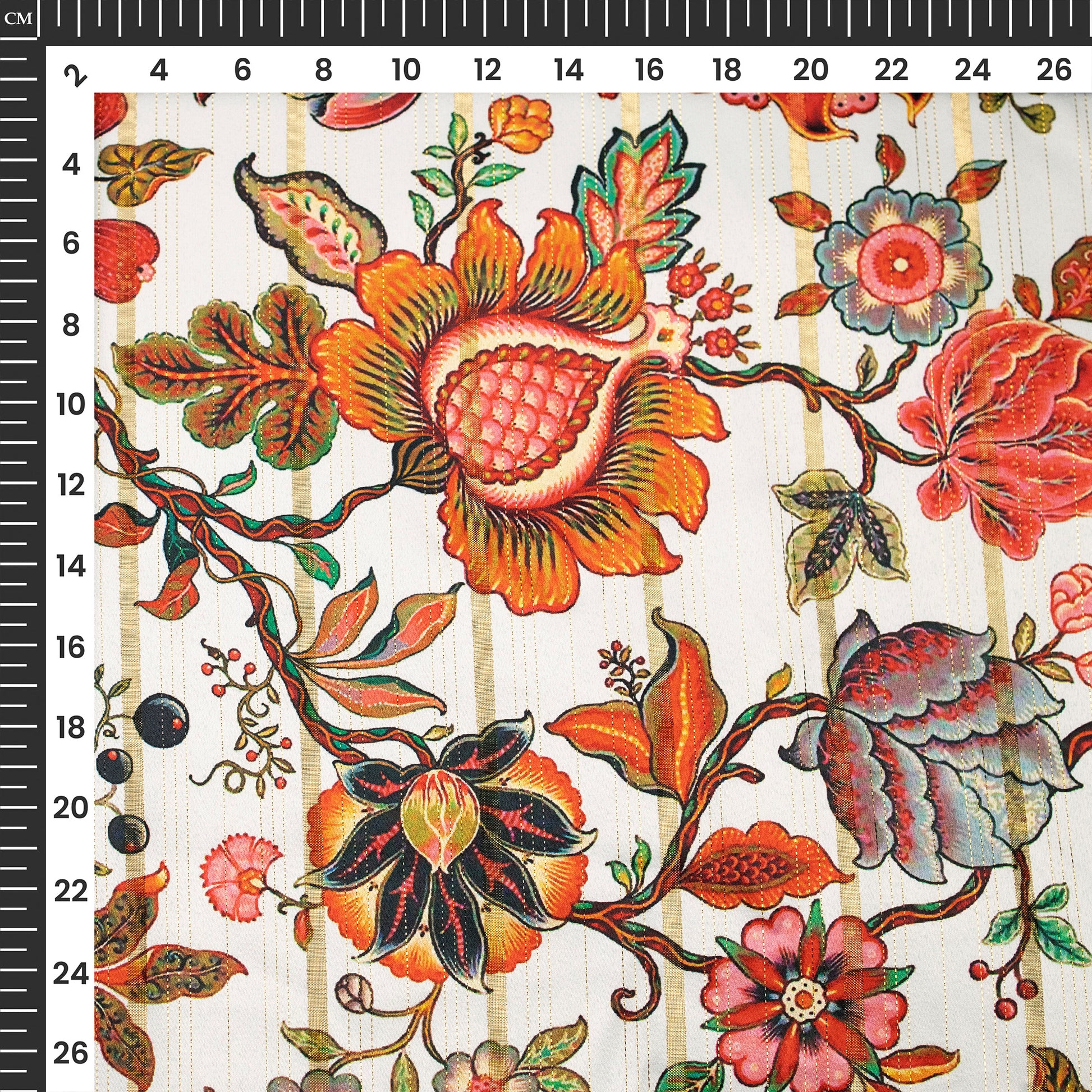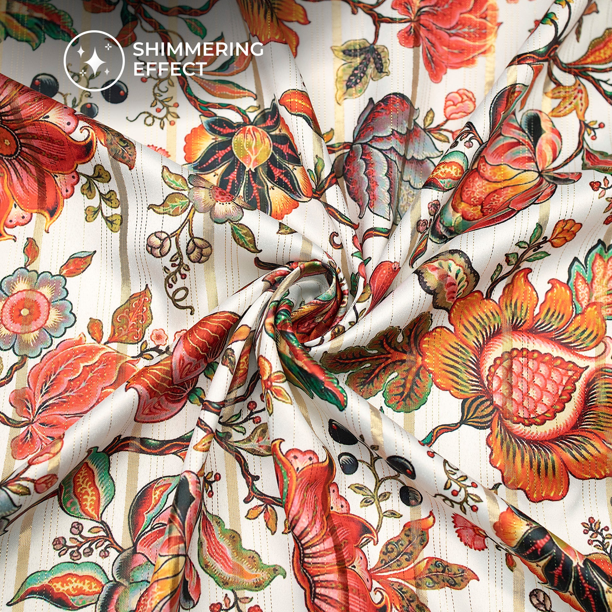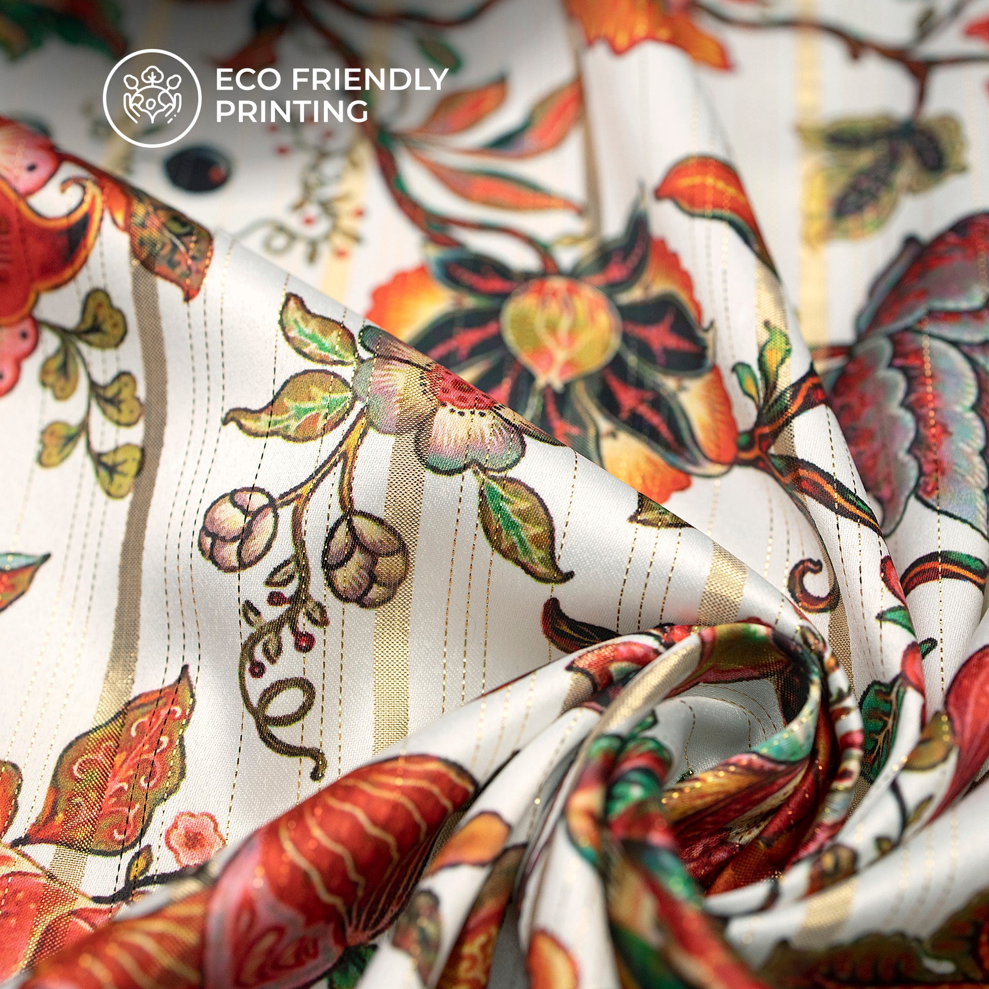 Cherry Red Floral Digital Print Golden Lurex Satin Fabric