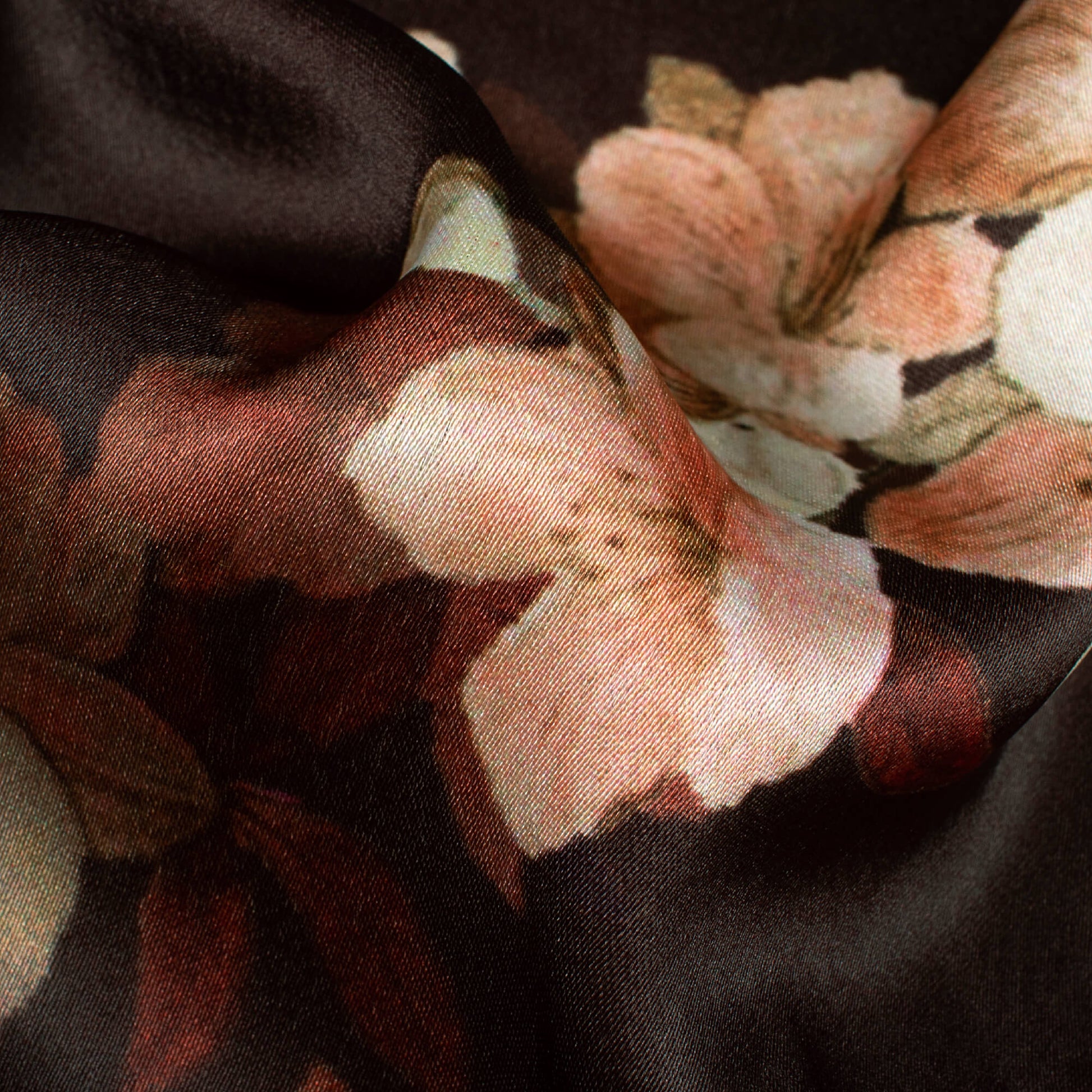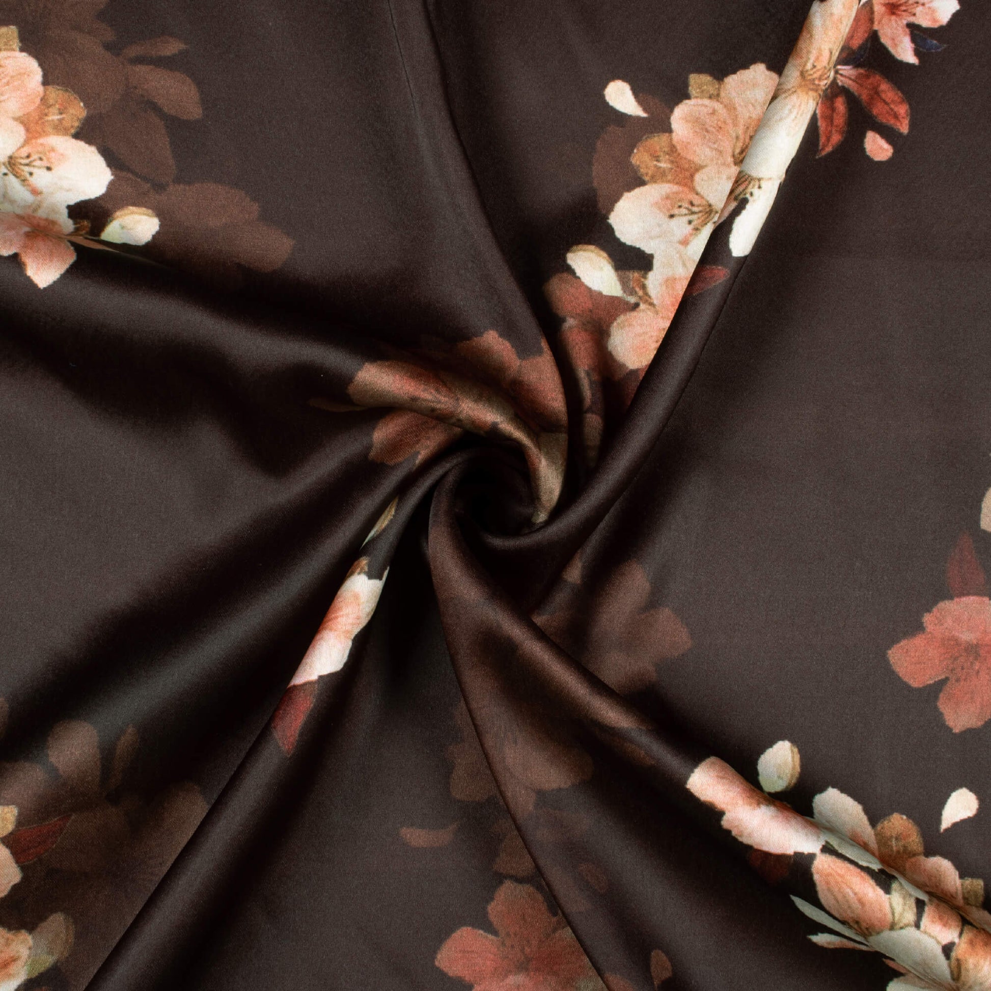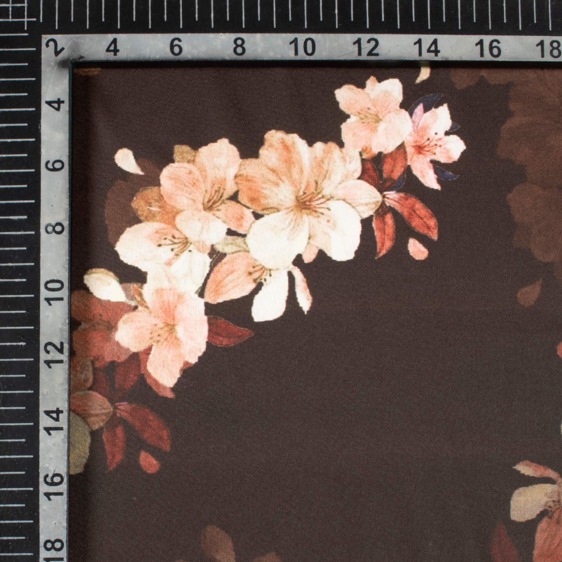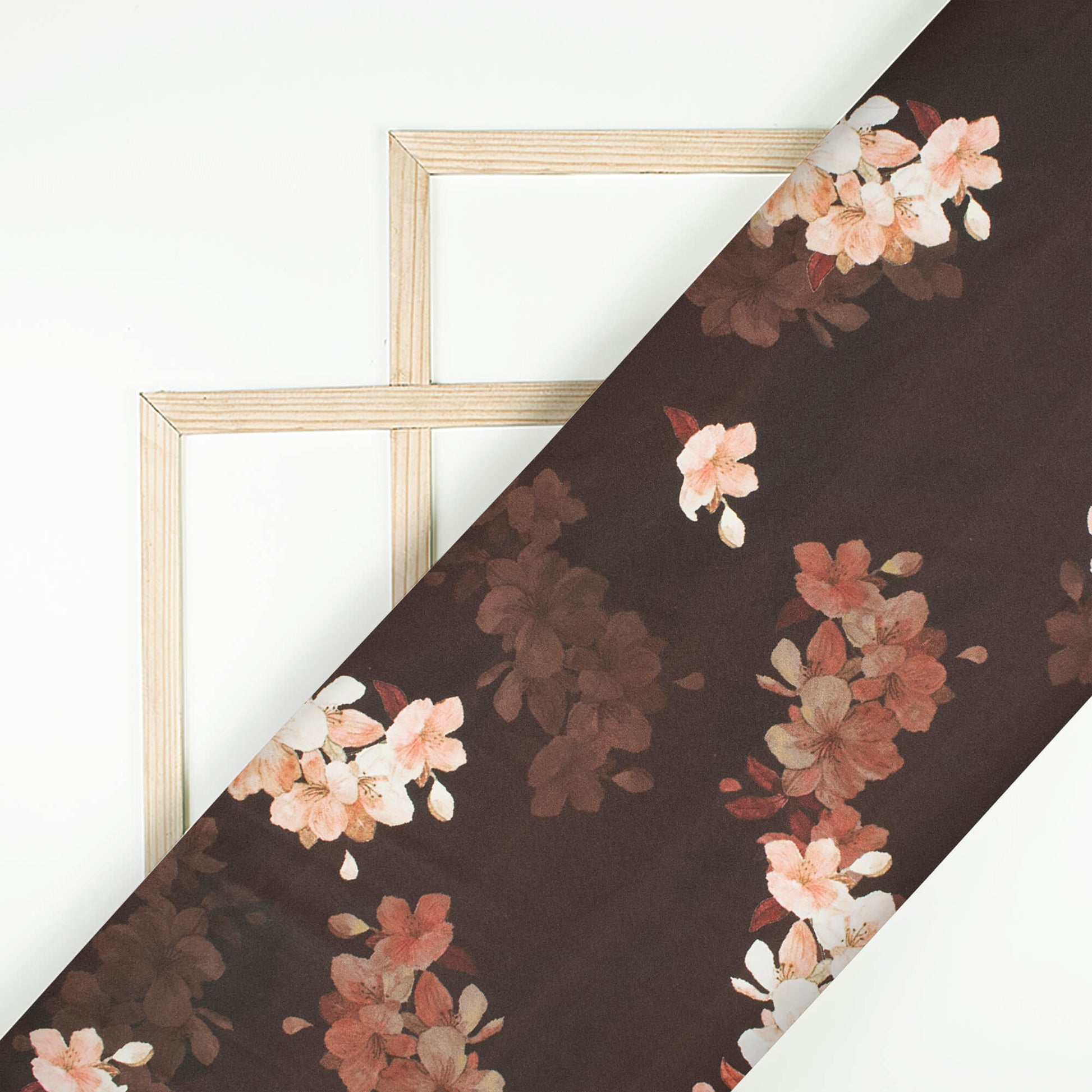 Dark Brown And Peach Floral Pattern Digital Print Japan Satin Fabric