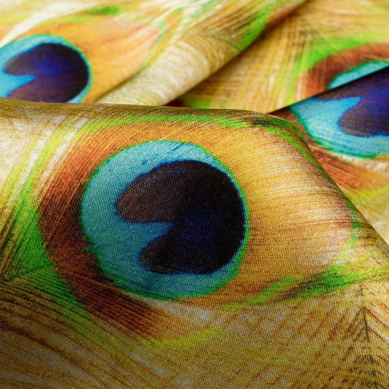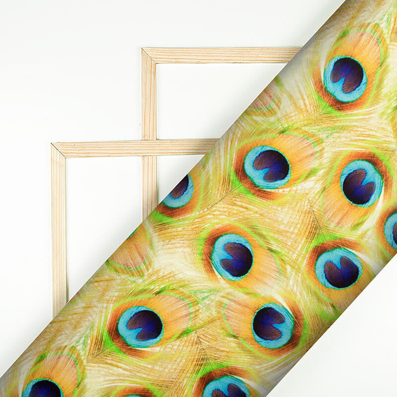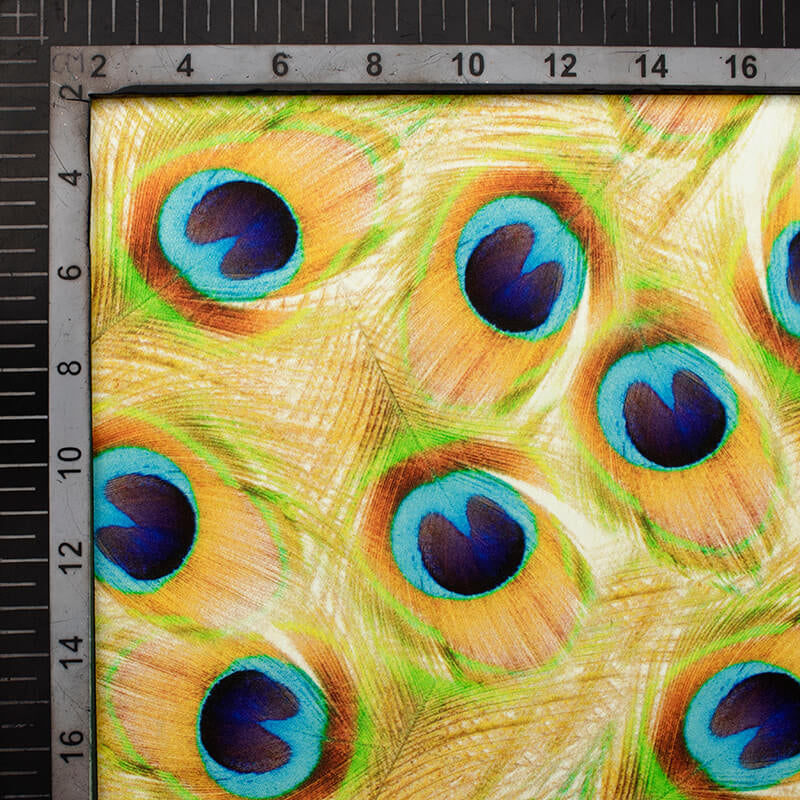 Gold Yellow And Navy Blue Peacock Feather Pattern Digital Print Japan Satin Fabric