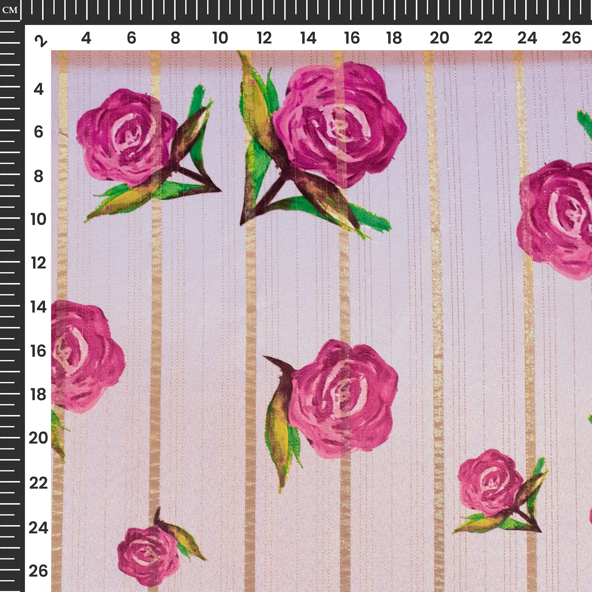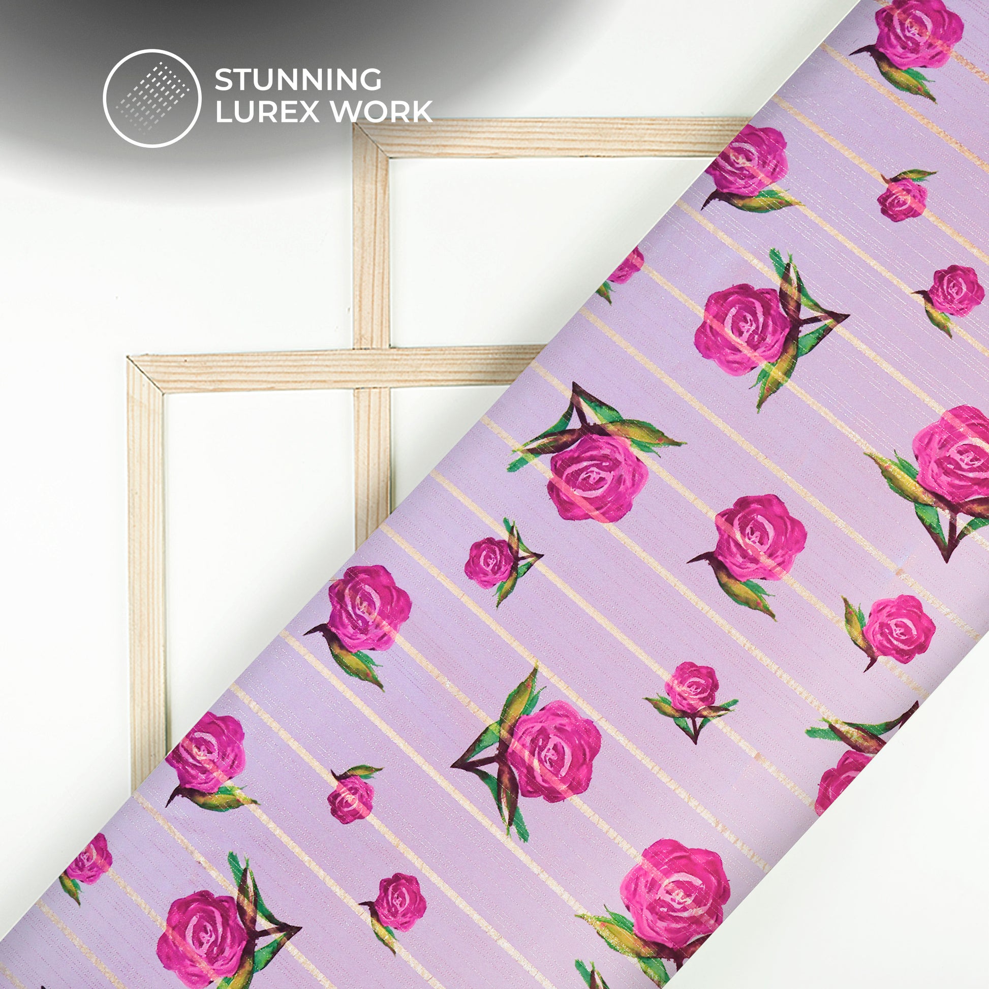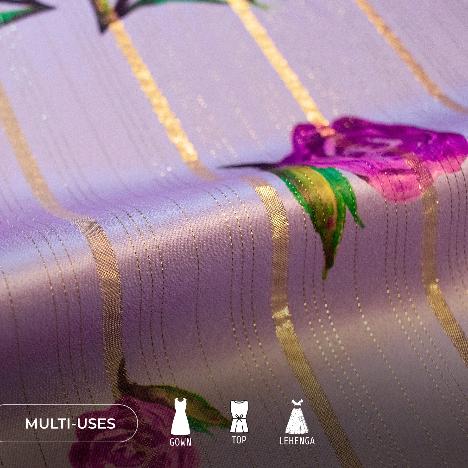 Lavender Purple Floral Digital Print Golden Lurex Satin Fabric