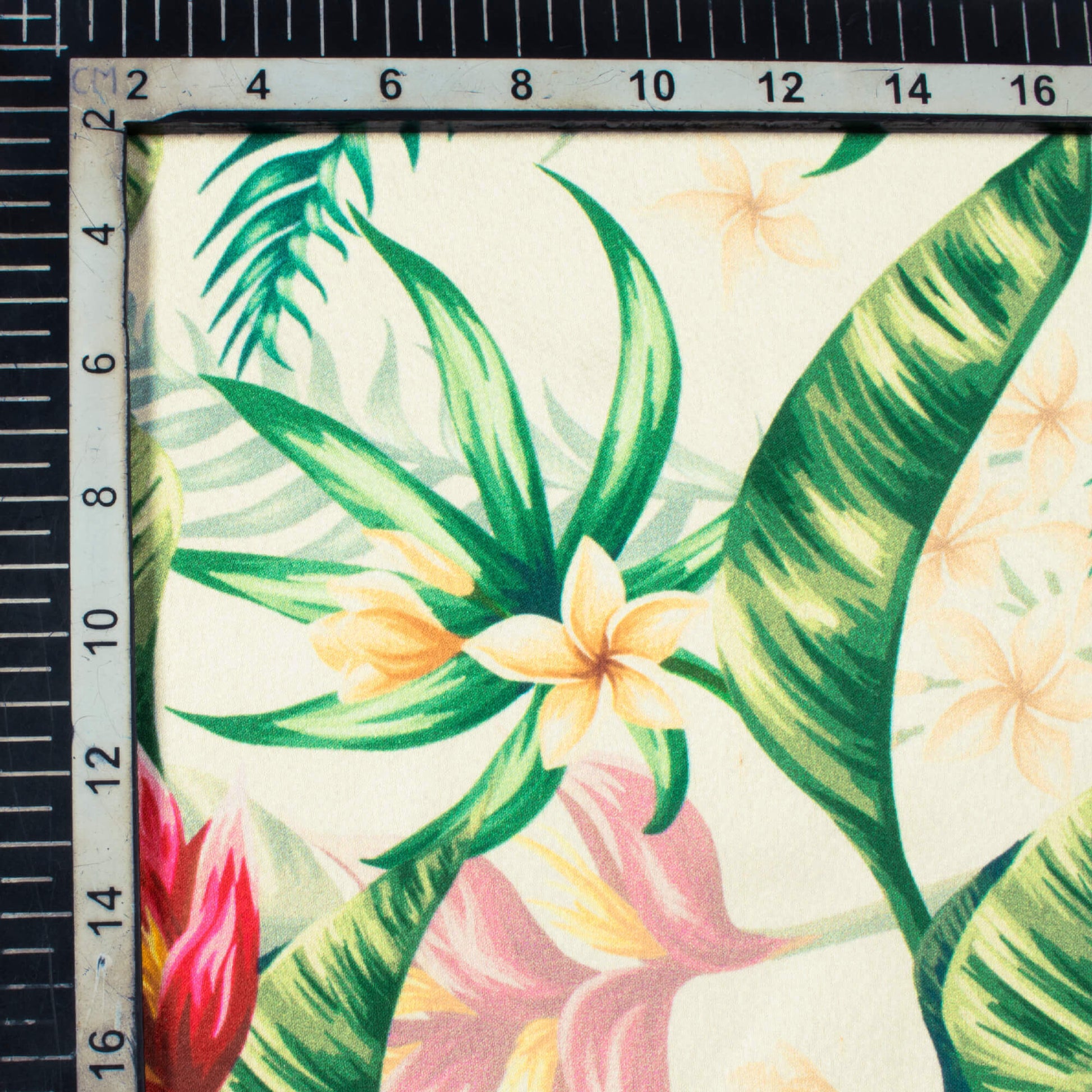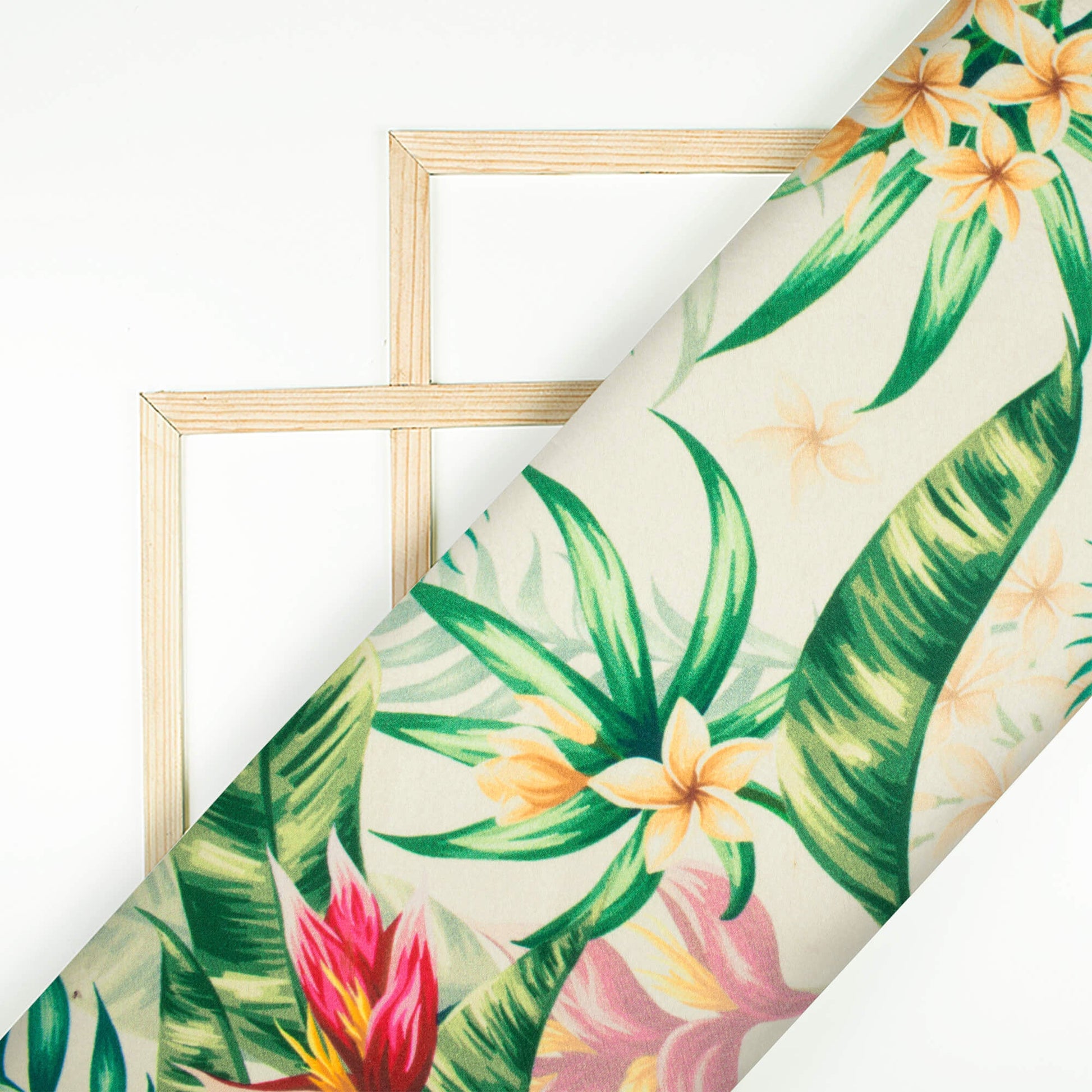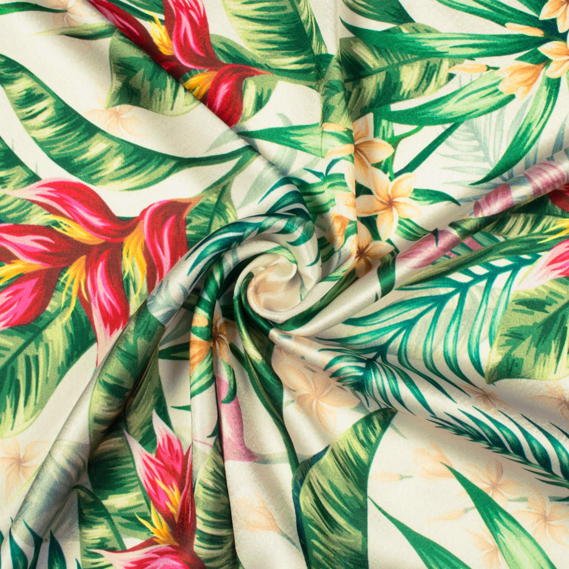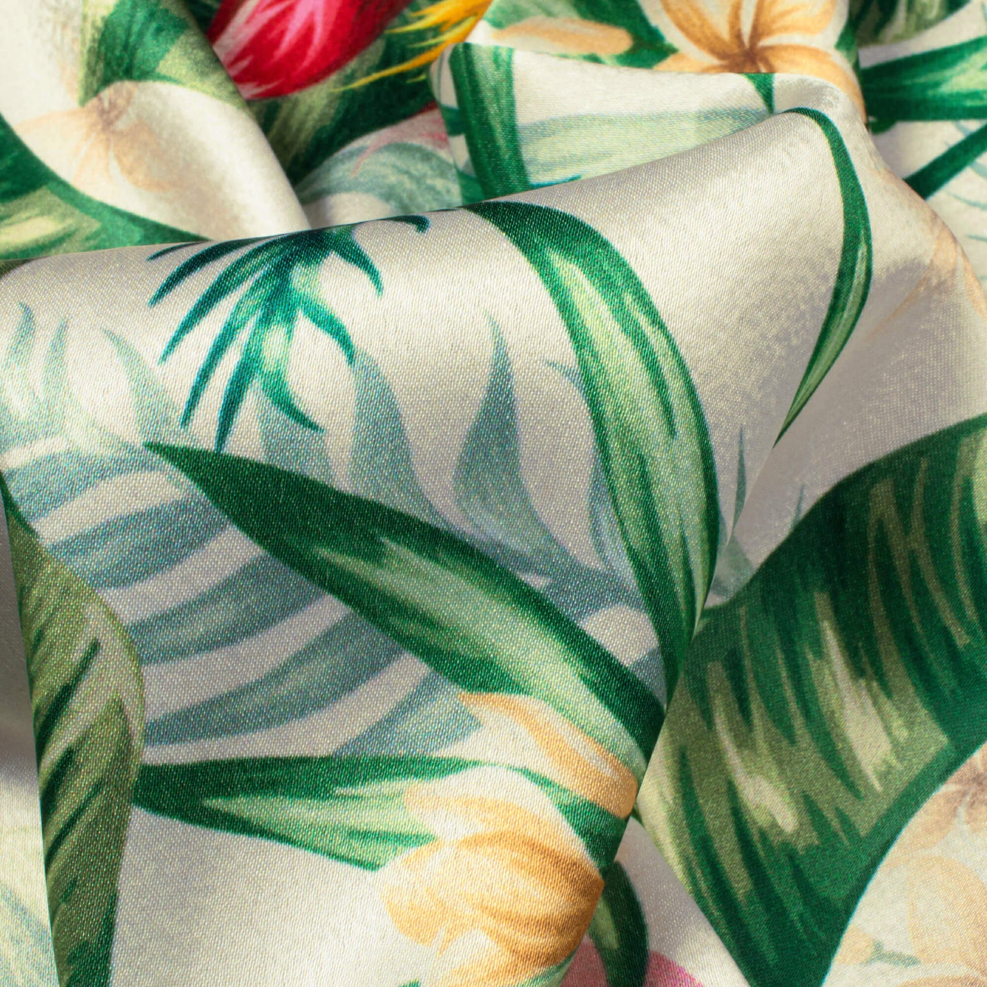 Oyster White And Green Tropical Pattern Digital Print Japan Satin Fabric