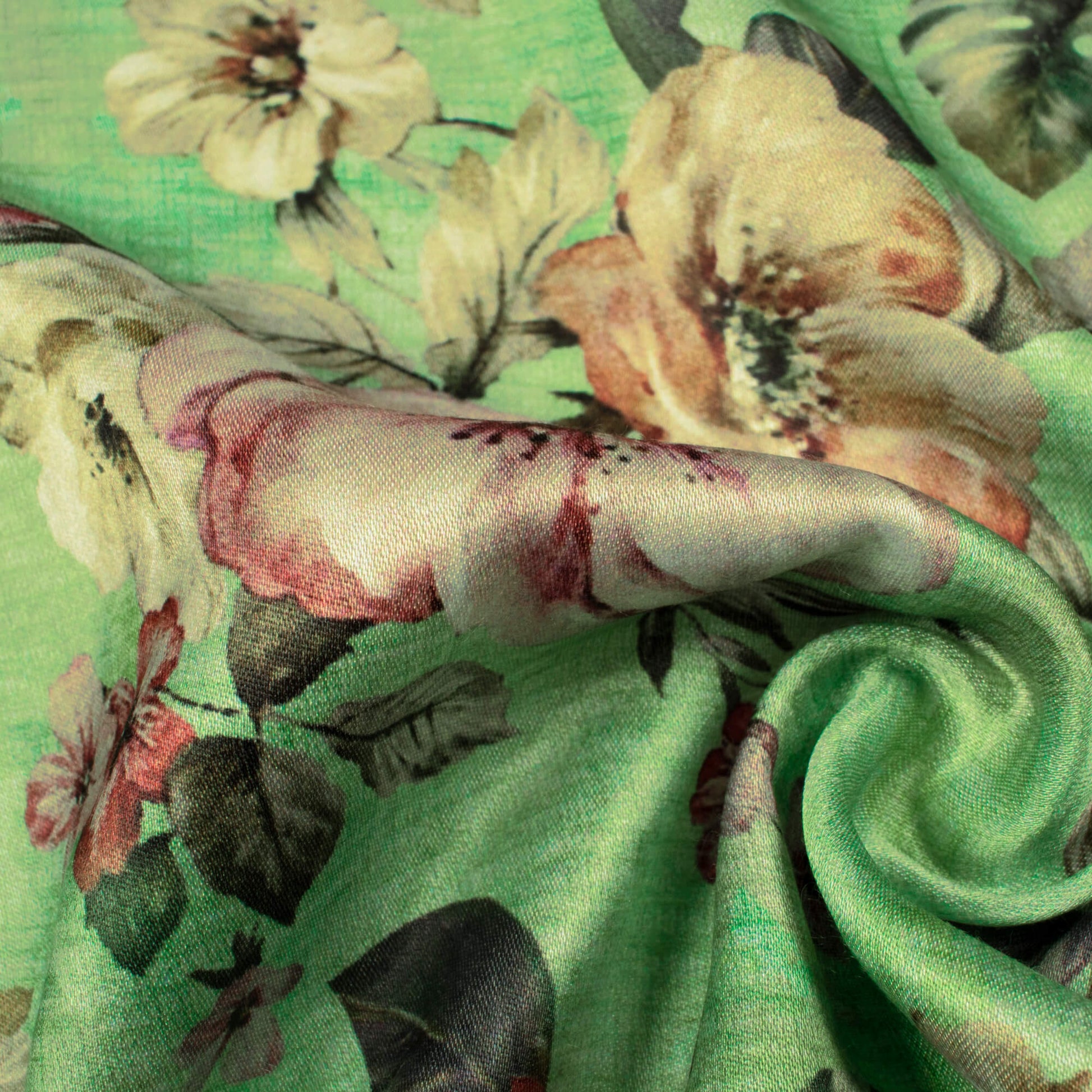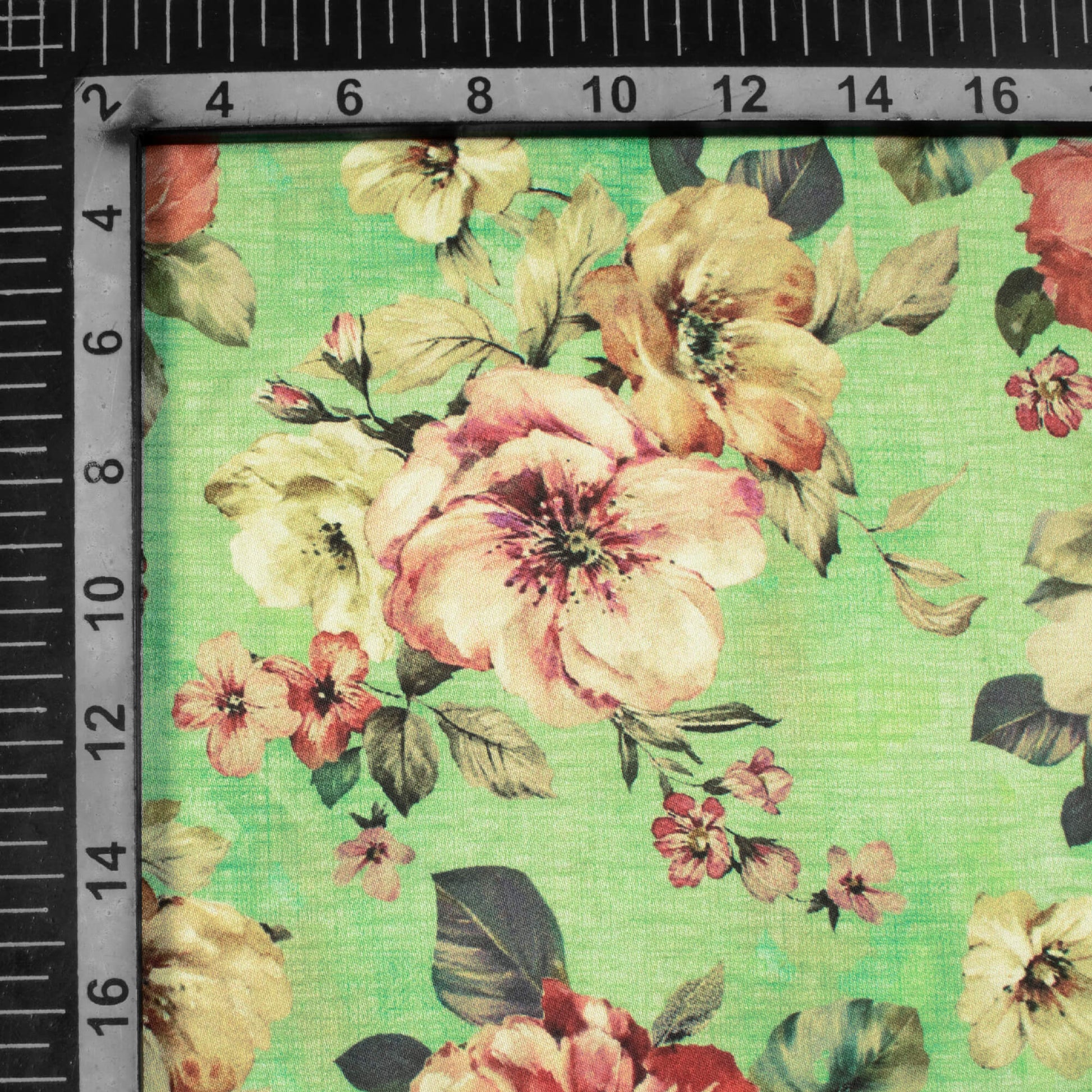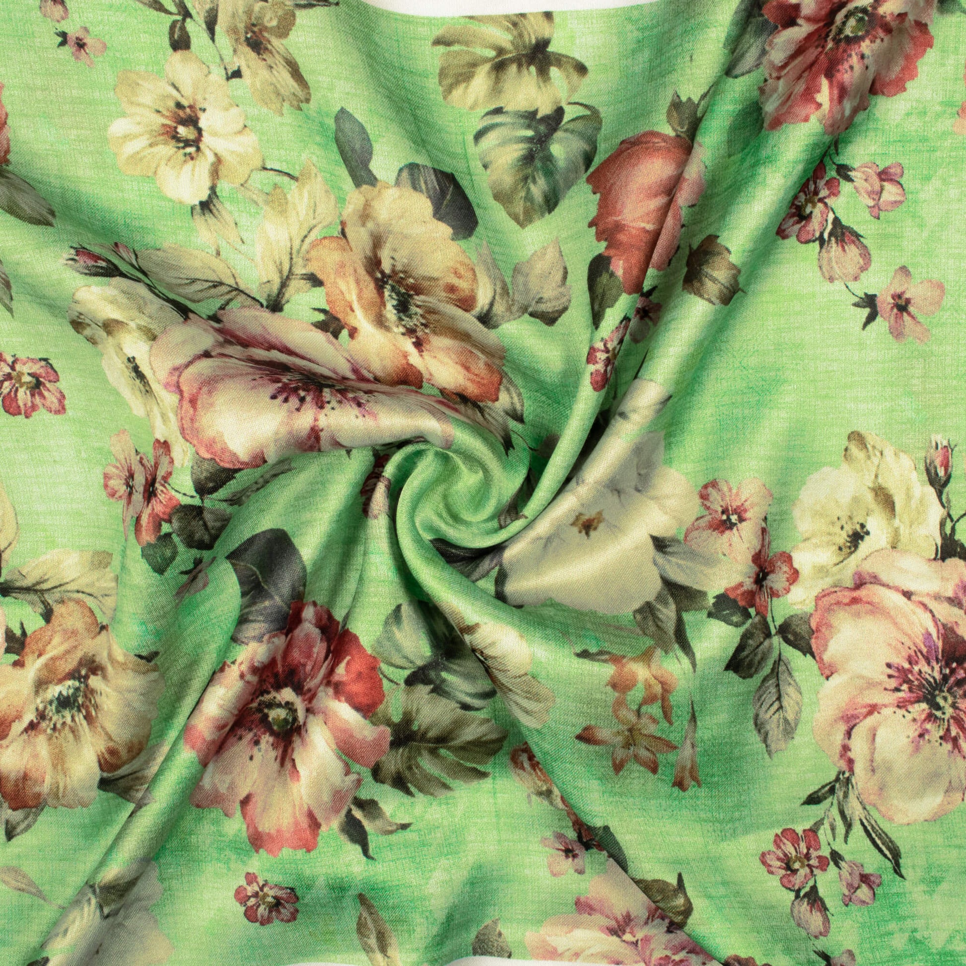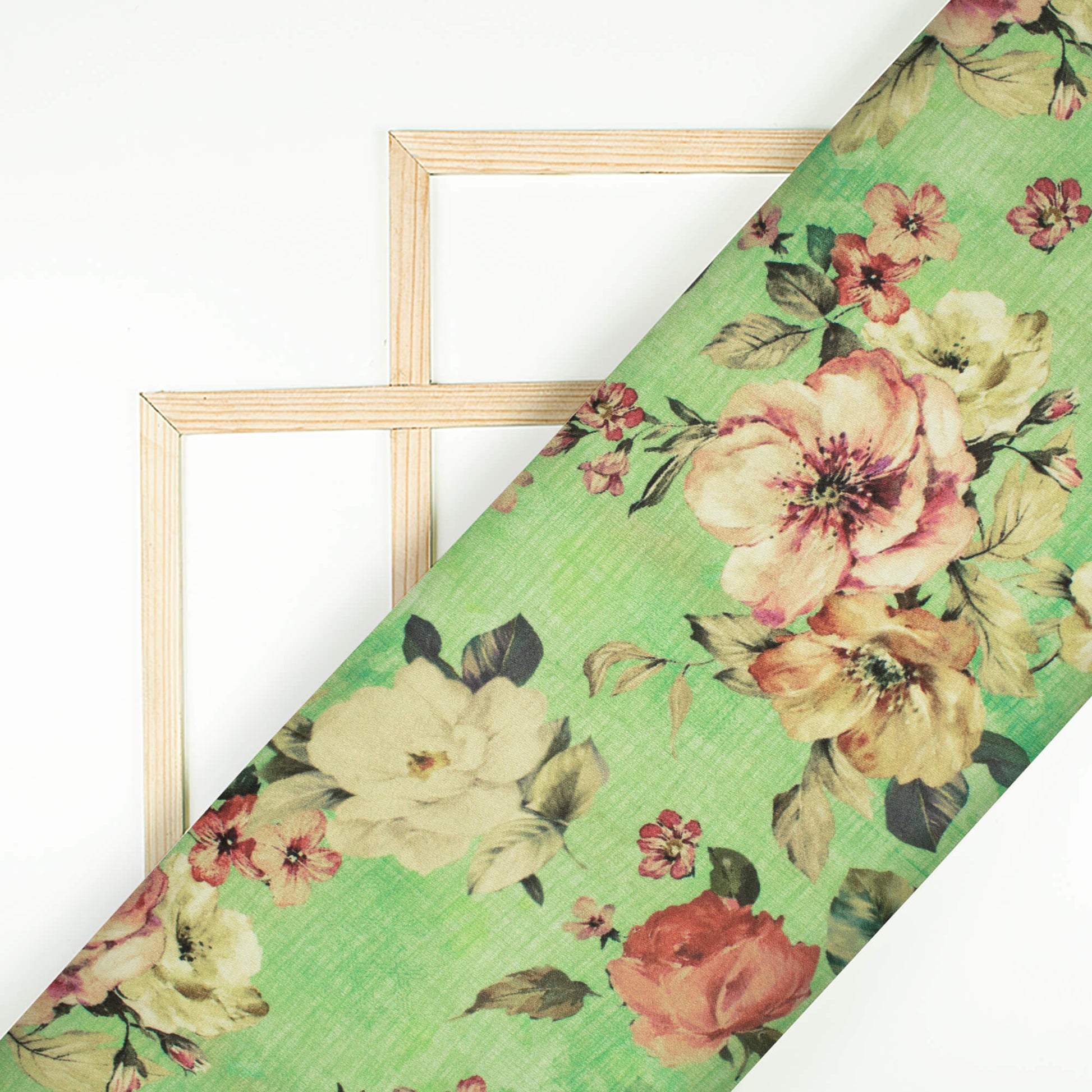 Paris Green And Coral Peach Floral Pattern Digital Print Premium Lush Satin Fabric