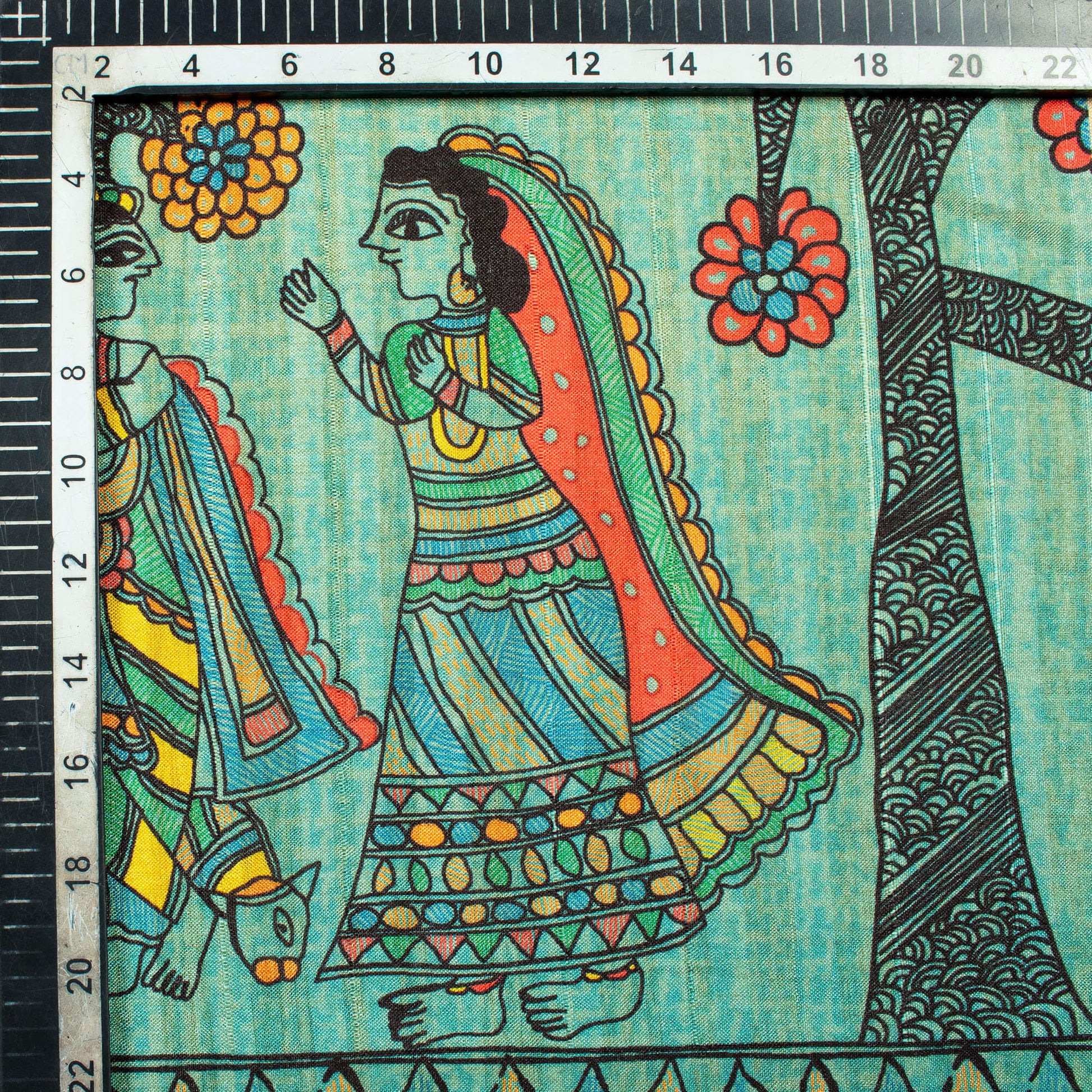 Sky Blue And Orange Madhuvanii Pattern Digital Print Art Tusser Silk Fabric
