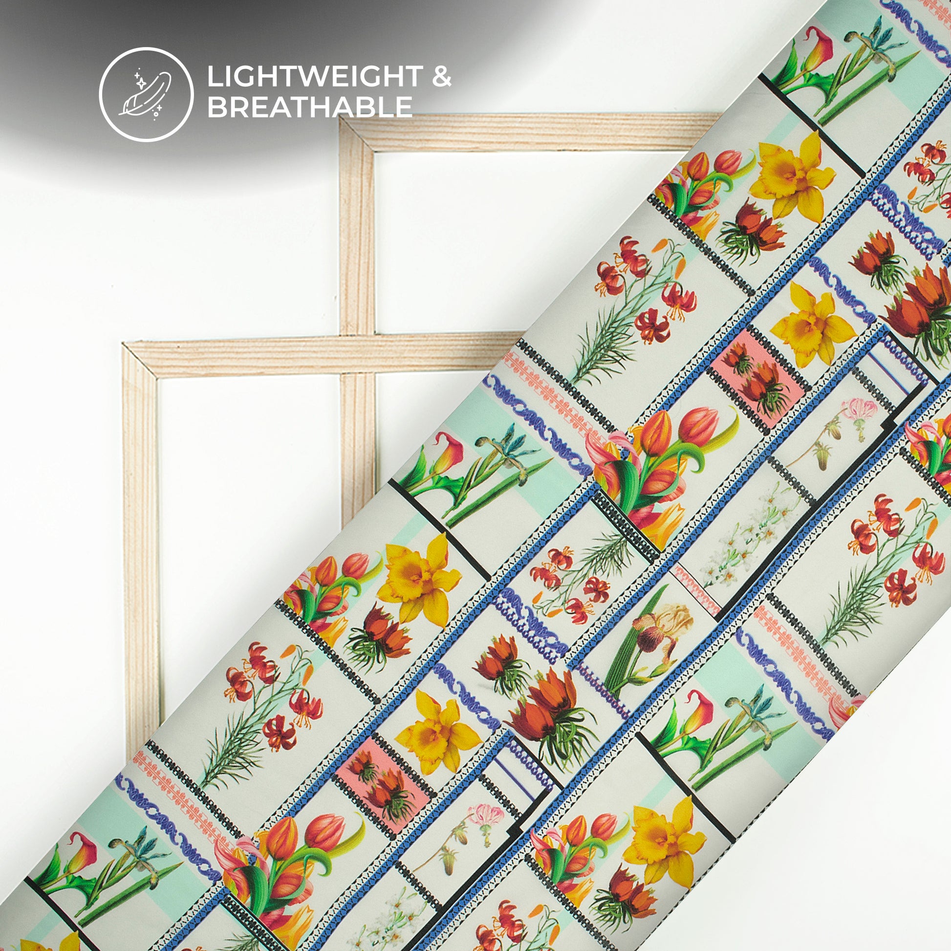 White Floral,Checks Digital Print Viscose Natural Crepe Fabric