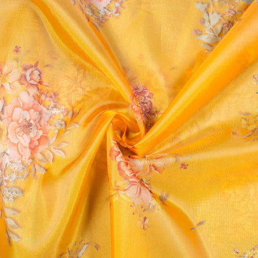 Dijjon Yellow And Pink Floral Pattern Digital Print Organza Satin Fabric Dijjon Yellow And Pink Floral Pattern Digital Print Organza Satin Fabric