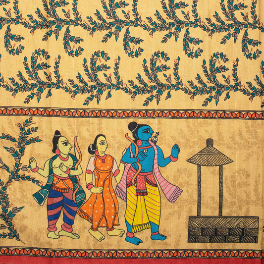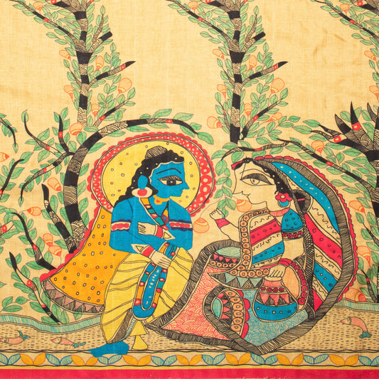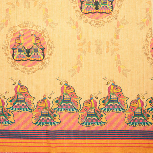 Cream And Gold Yellow Madhuvanii Pattern Digital Print Art Tusser Silk Fabric Cream And Gold Yellow Madhuvanii Pattern Digital Print Art Tusser Silk Fabric