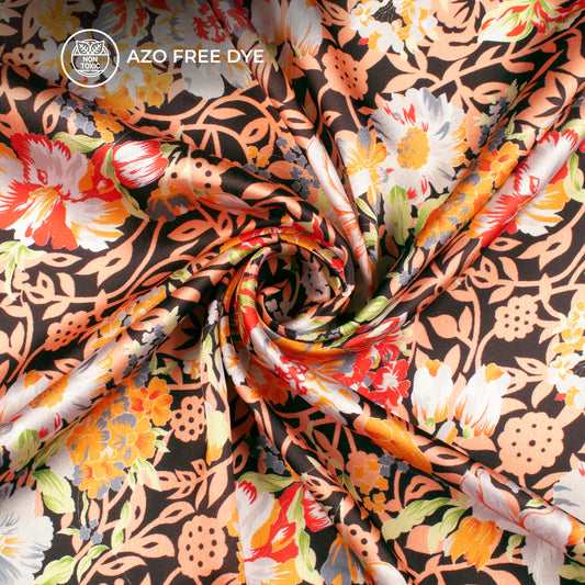 -10% offBlack And Peach Floral Digital Print Japan Satin Fabric Black And Peach Floral Digital Print Japan Satin Fabric
