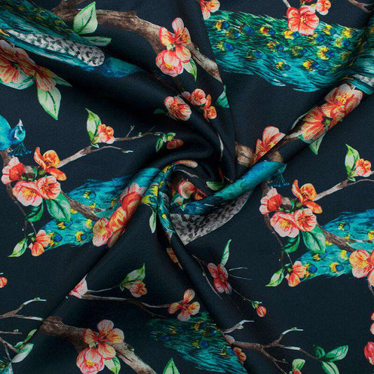 -10% offBlack And Blue Peacock Pattern Digital Print Japan Satin Fabric Black And Blue Peacock Pattern Digital Print Japan Satin Fabric