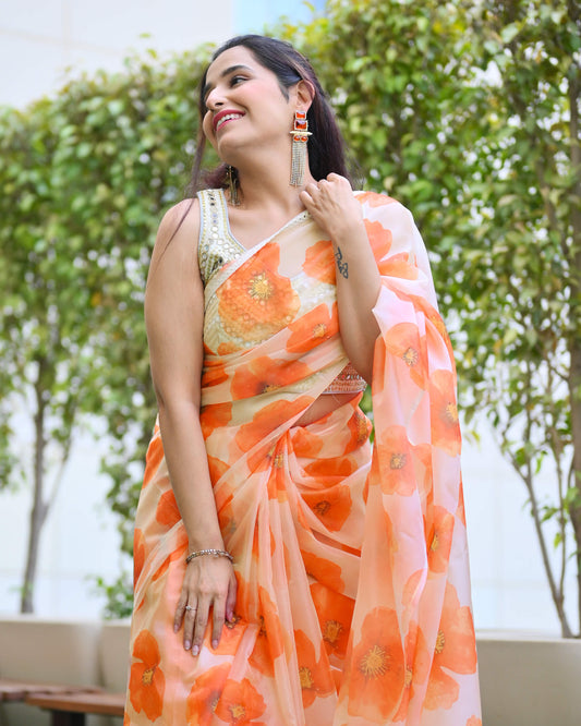 White And Orange Floral Pattern Liquid Organza Saree With Foil Mirror Wrok Lace Border White And Orange Floral Pattern Liquid Organza Saree With Foil Mirror Wrok Lace BorderRegular price ₹ 2,999.00Unit price perSale price ₹ 2,999.00 Regular price₹ 2,699.00