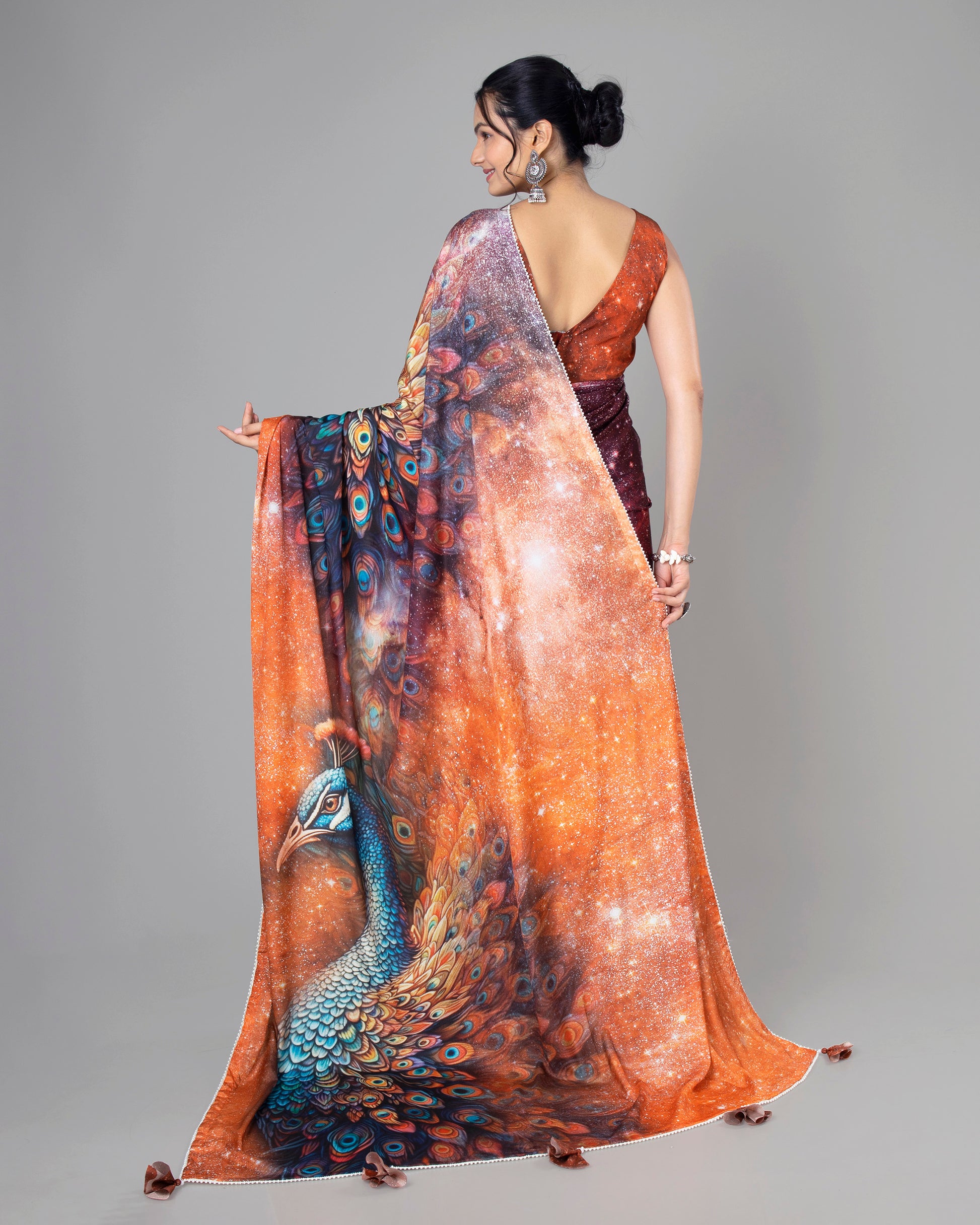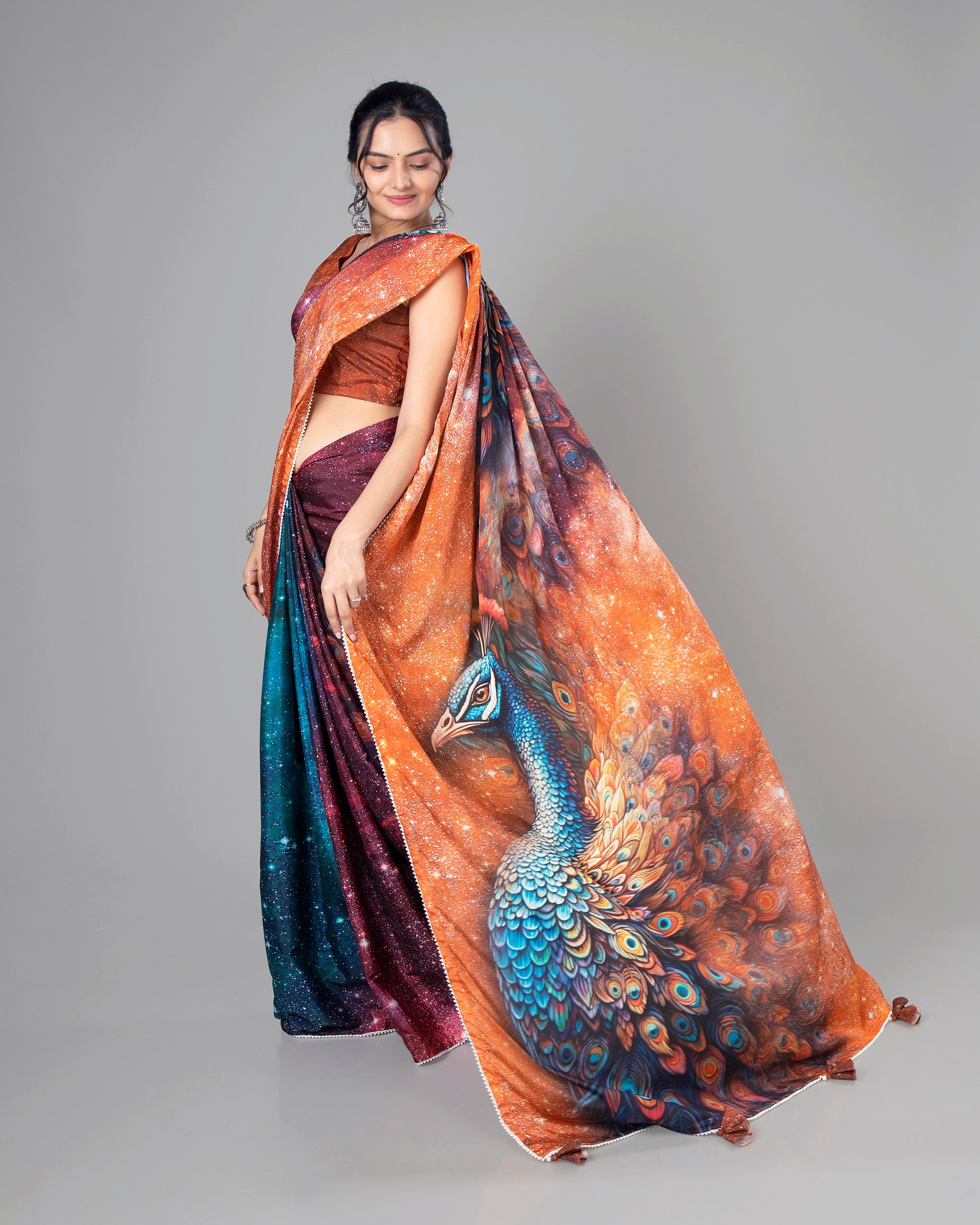 Up your style game with this exclusive designer saree! Made of gorgeous silk and featuring a stunning ombre design, you'll be ready to make a statement everywhere you go. Get ready to wow the crowd in this Bollywood-approved look!