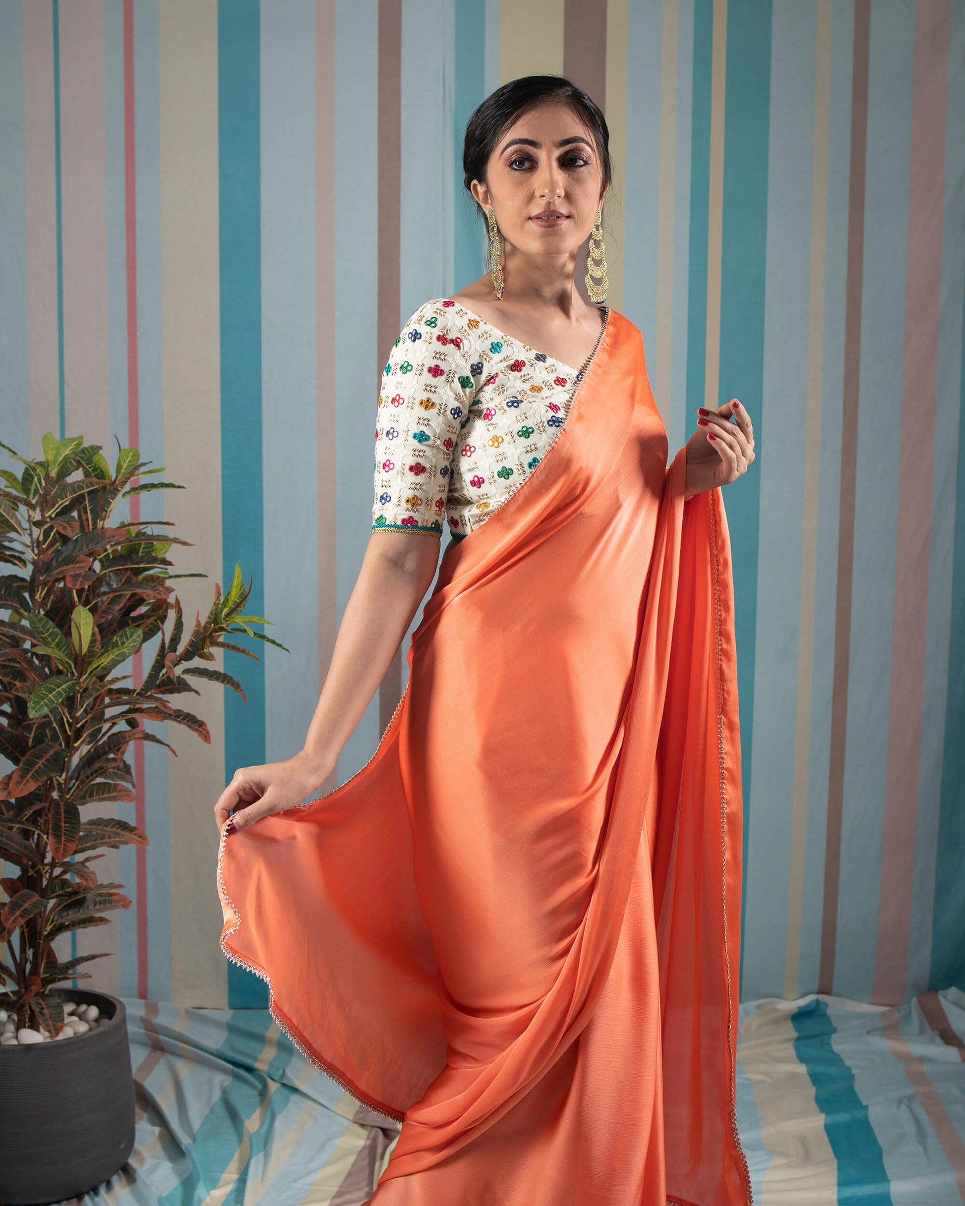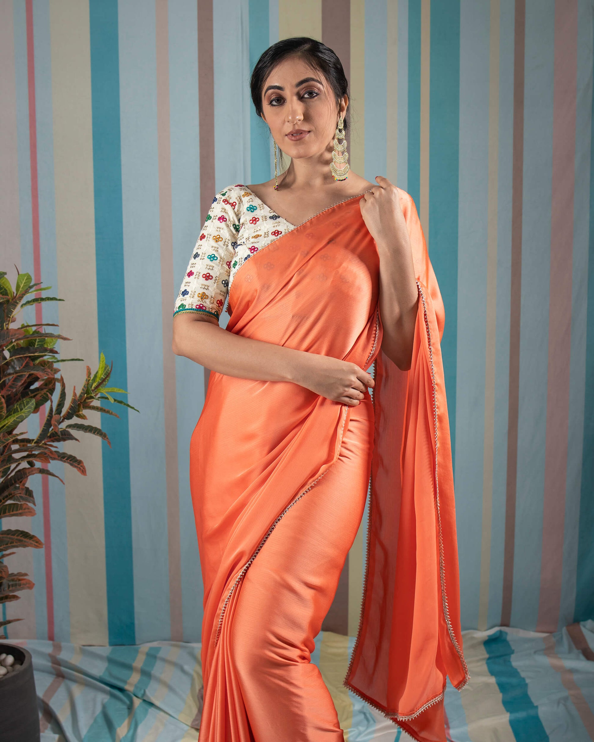 Salmon Orange Plain Chiffon Satin Saree With Lace Border