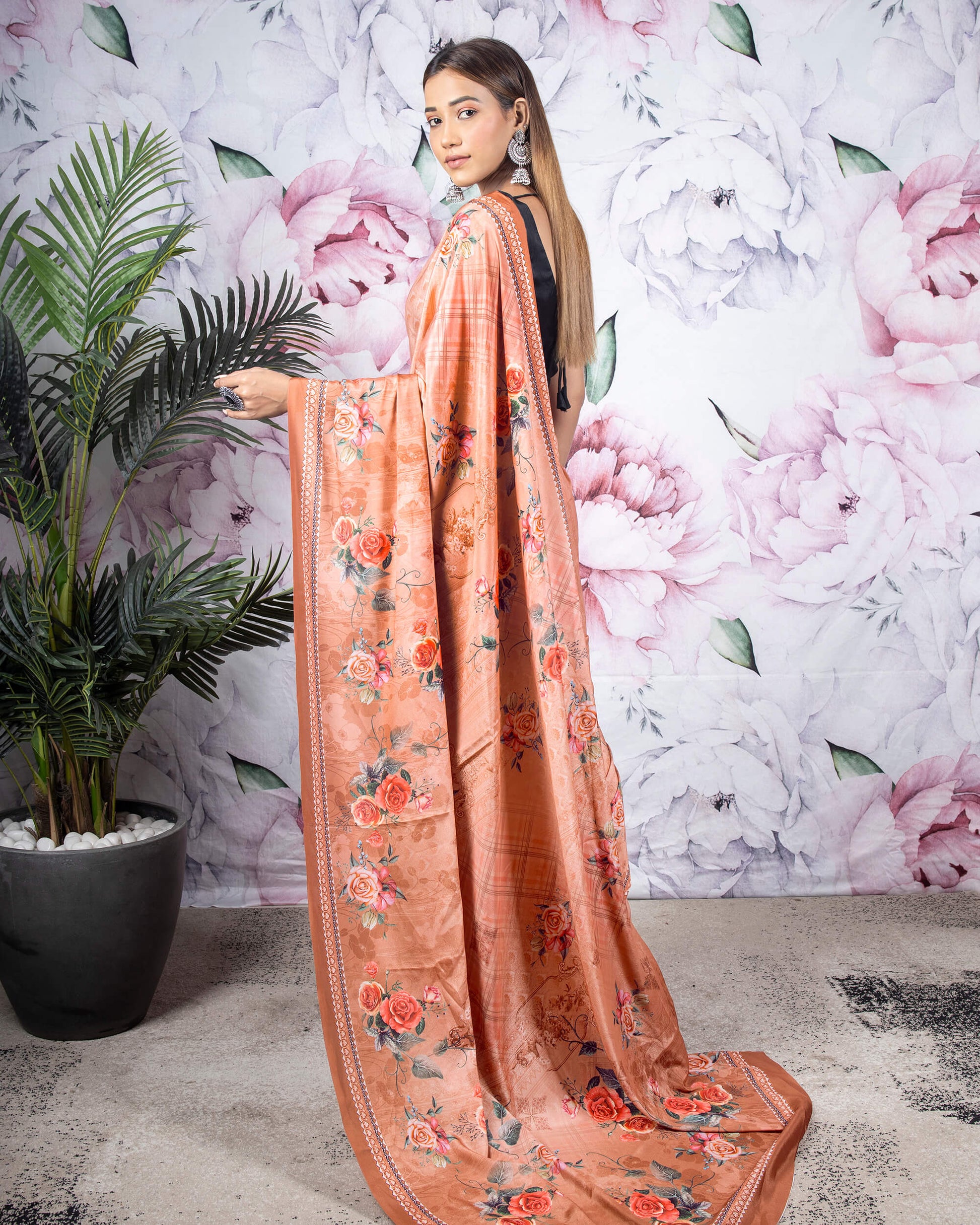 Sandy Brown And Pink Floral Pattern Digital Print Crepe Silk Saree
