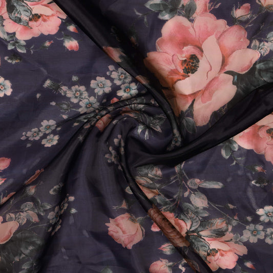 -10% offNavy Blue Floral Digital Print Organza Satin Fabric Navy Blue Floral Digital Print Organza Satin Fabric