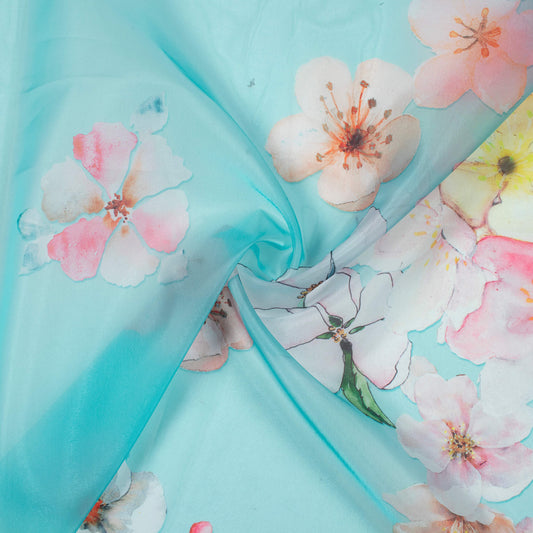 -10% offTeal Blue And Peach Floral Pattern Digital Print Organza Satin Fabric Teal Blue And Peach Floral Pattern Digital Print Organza Satin Fabric