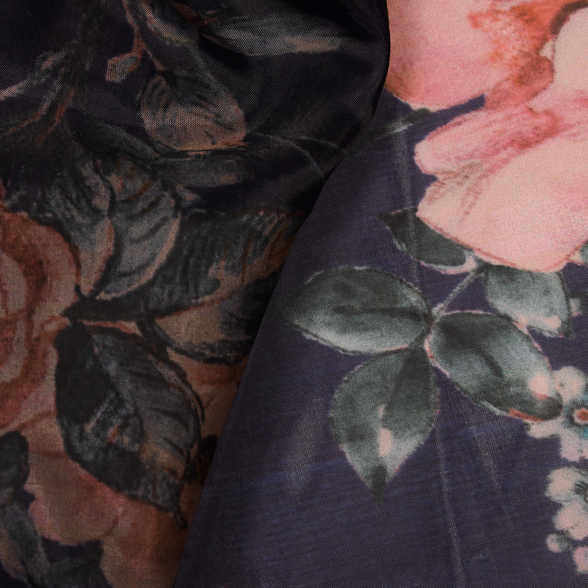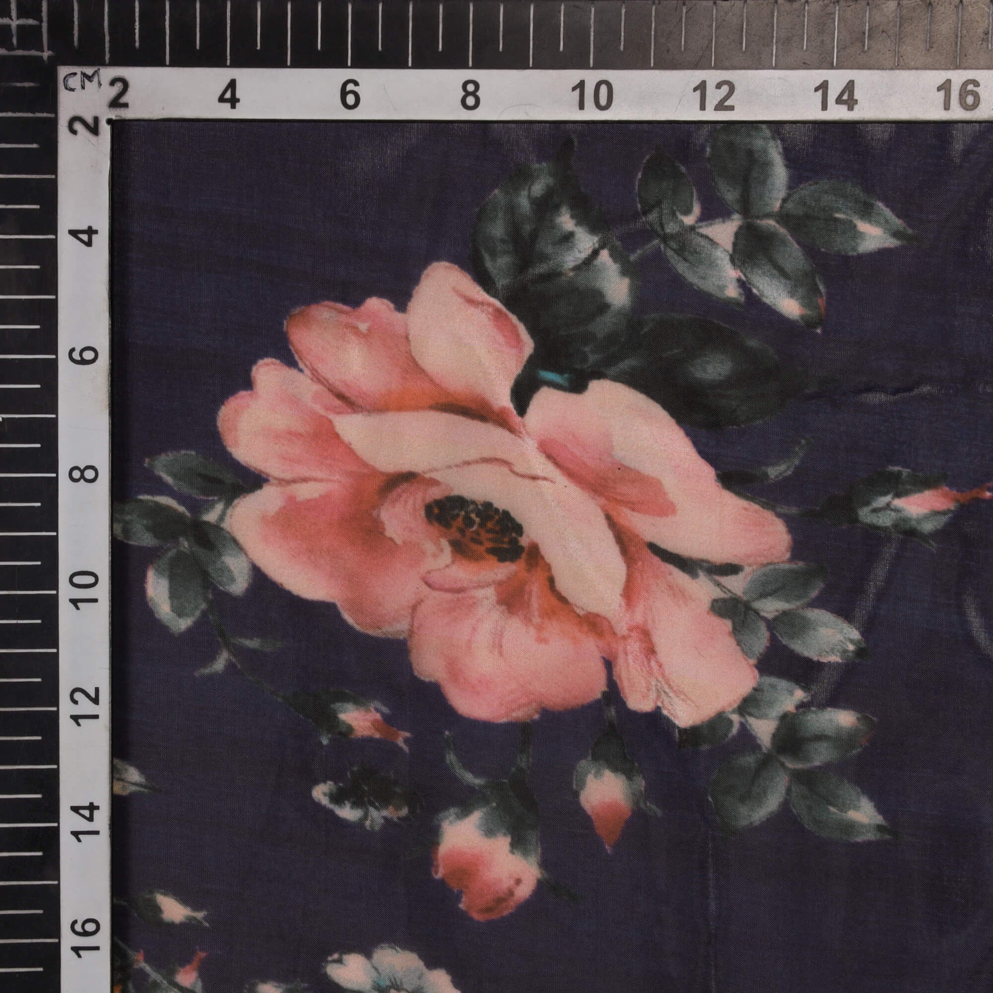 Navy Blue Floral Digital Print Organza Satin Fabric