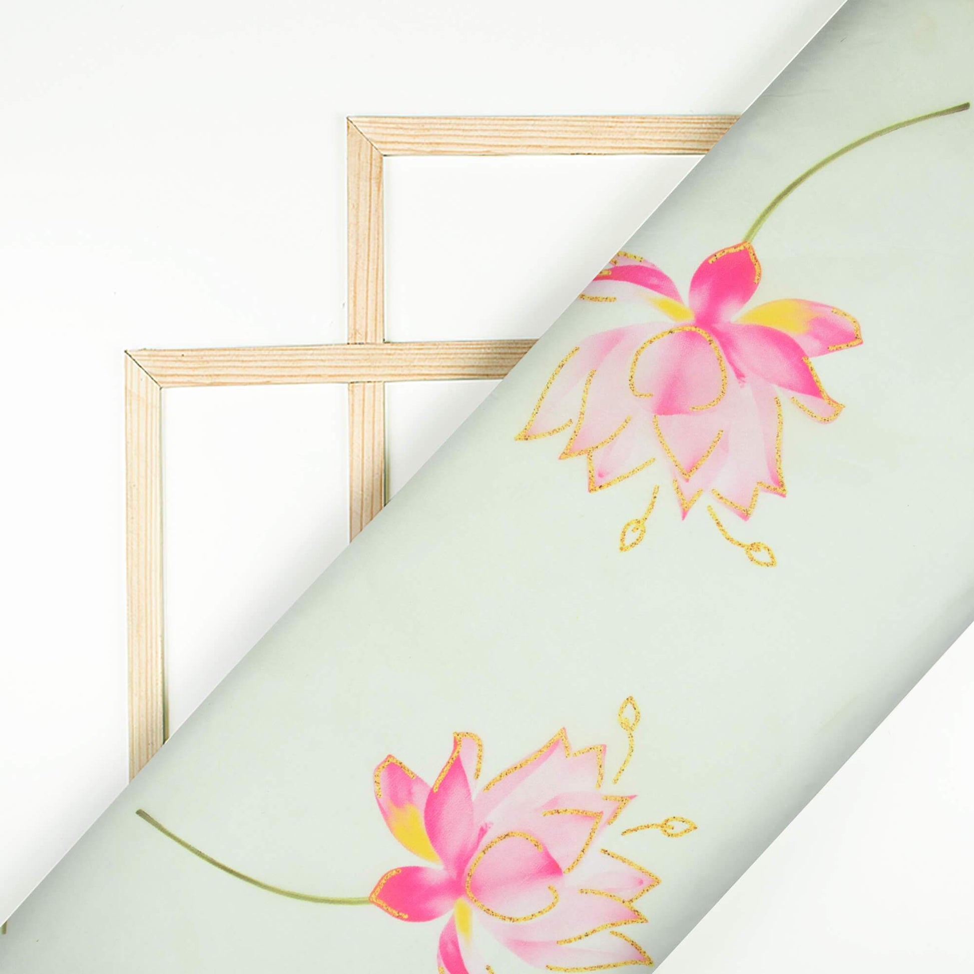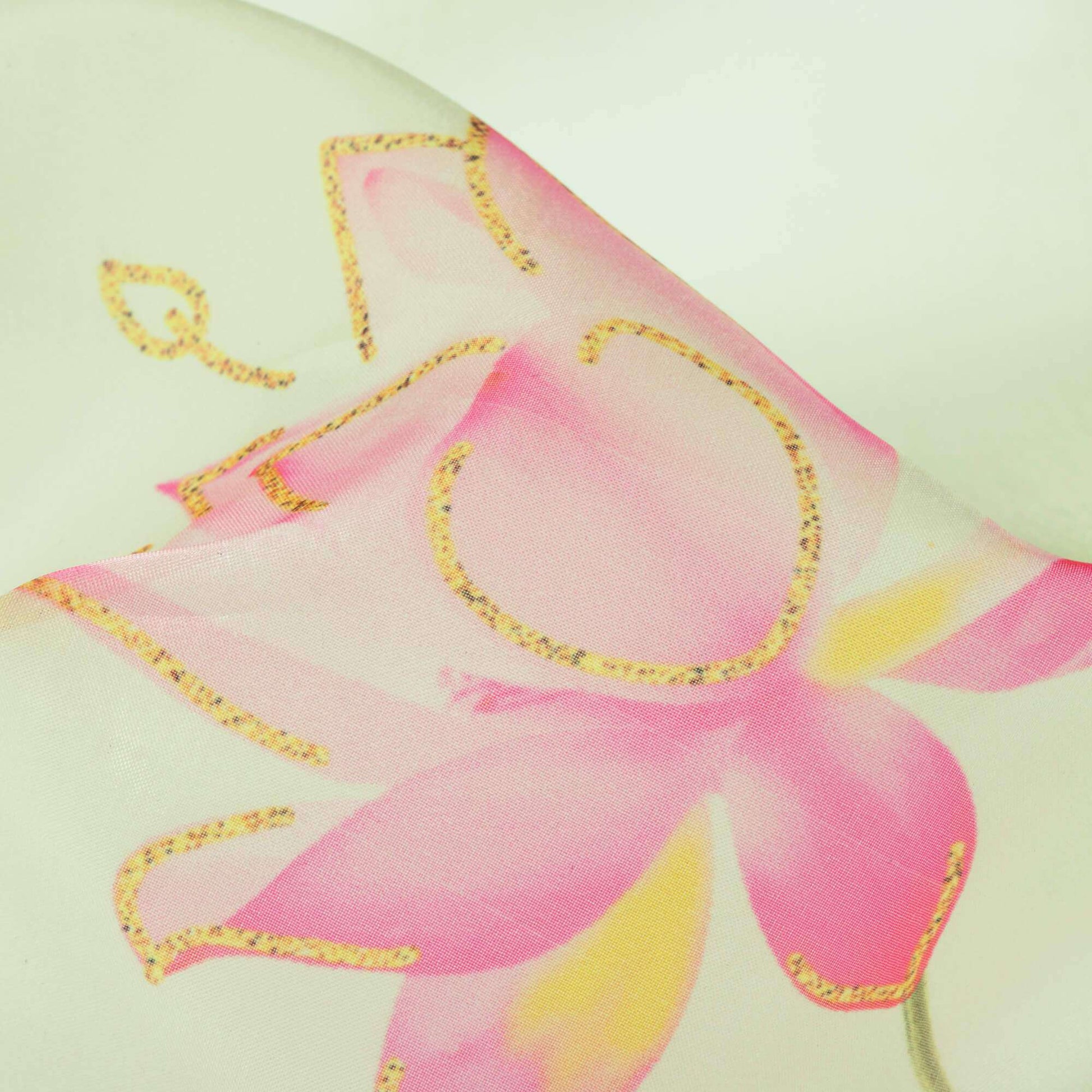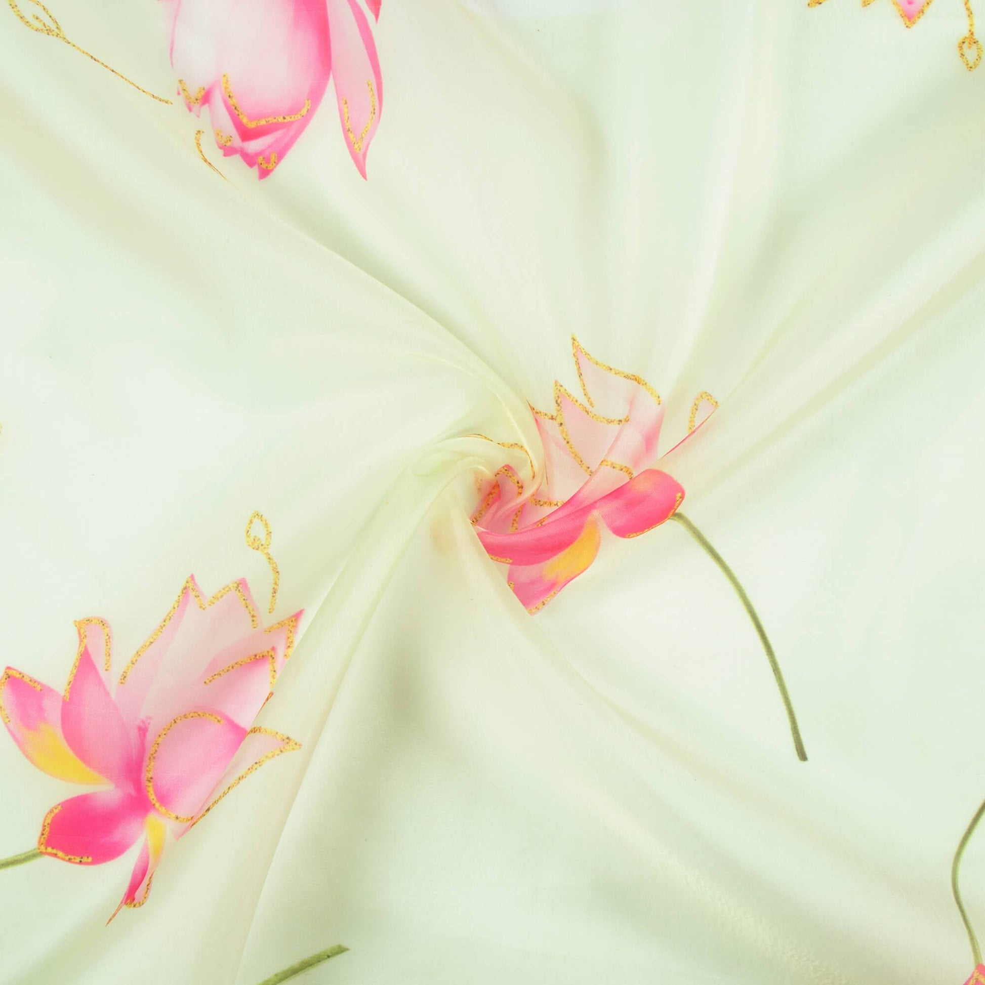Tea Green And Rose Pink Floral Pattern Hand Paint Effect Digital Print Premium Organza Satin Fabric