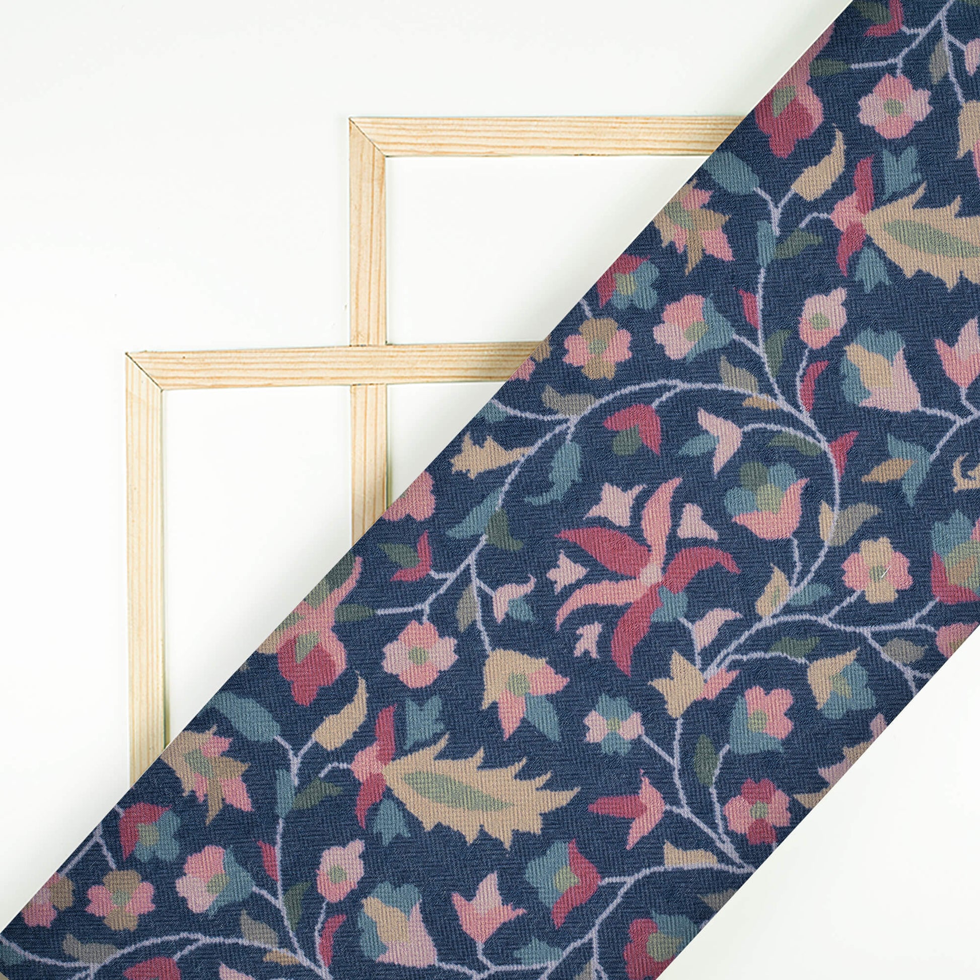 Prussian Blue And Red Floral Pattern Digital Print Elegant Blend Pasmina Fabric