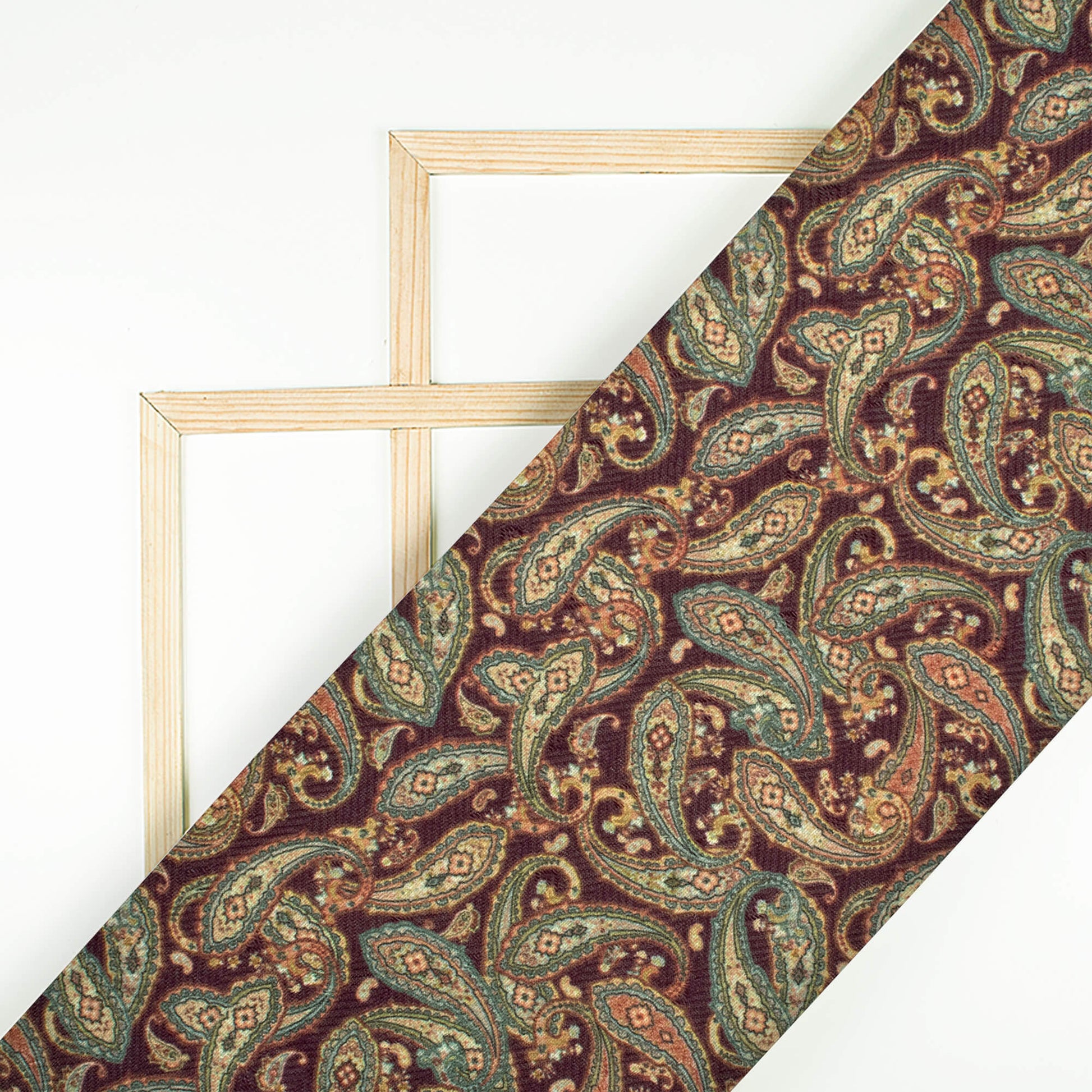 Mahogany Red And Smalt Blue Paisley Pattern Digital Print Elegant Blend Pashmina Fabric
